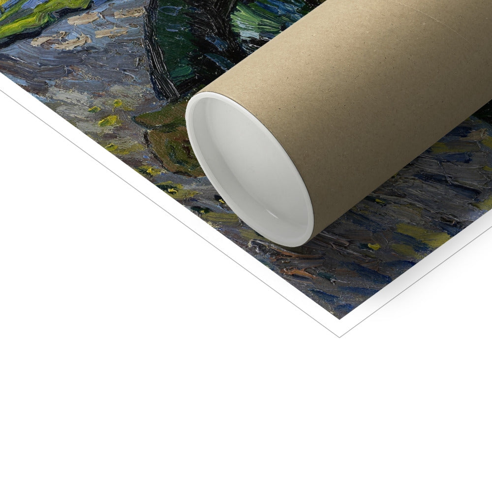 The Sower (1888) by Vincent van Gogh is an expressive oil painting depicting a sower planting seeds beneath a radiant, oversized sun. The composition features bold, vibrant colors—golden yellows and greens dominate the sky, contrasting with the deep blues and purples of the ground. The tree in the foreground leans dramatically, creating a dynamic frame for the figure. Van Gogh’s thick, swirling brushstrokes convey a sense of movement and energy, reflecting his fascination with nature, rural life, and the cycles of growth and renewal. The painting evokes a deep emotional connection to the landscape and its spiritual symbolism.