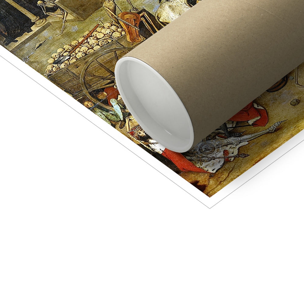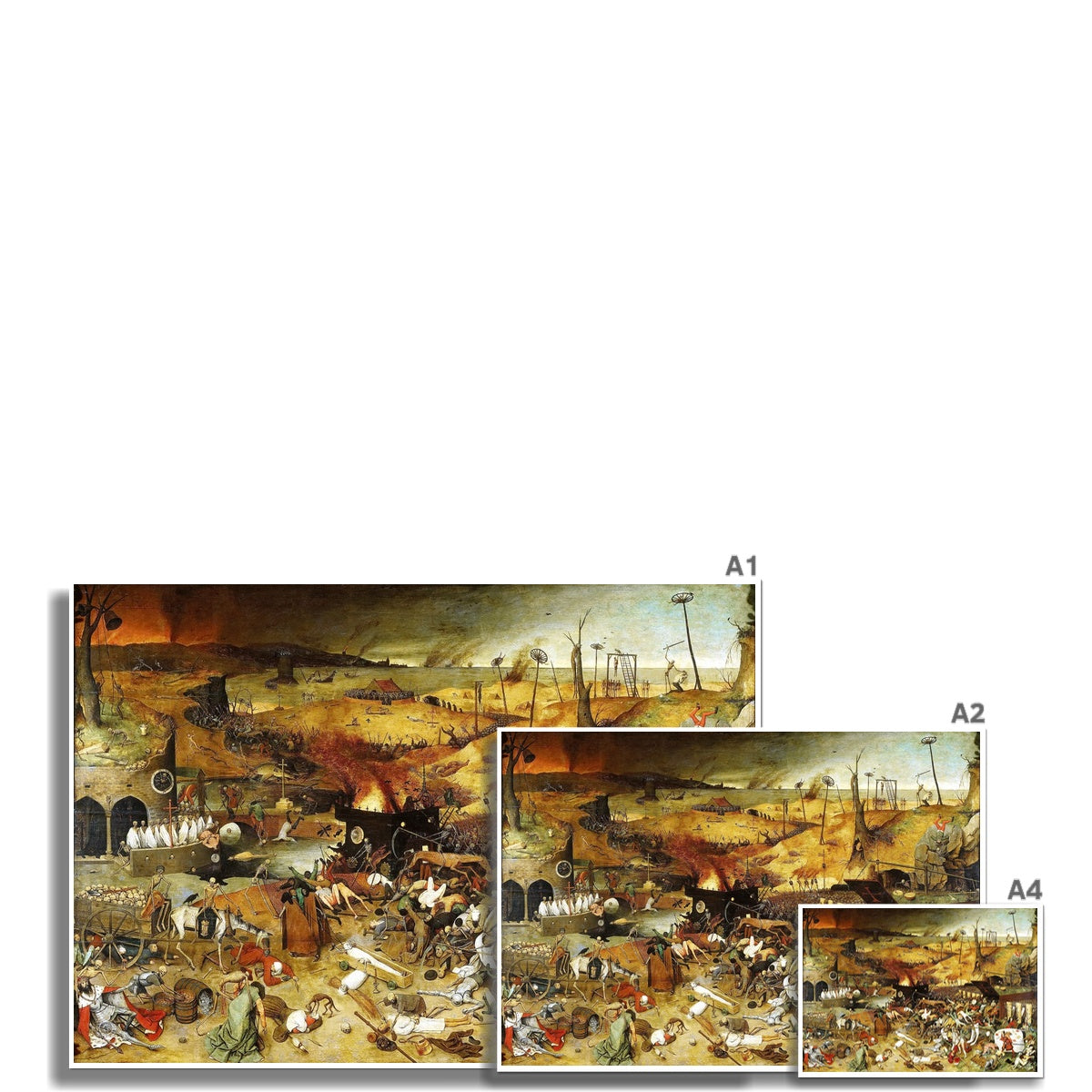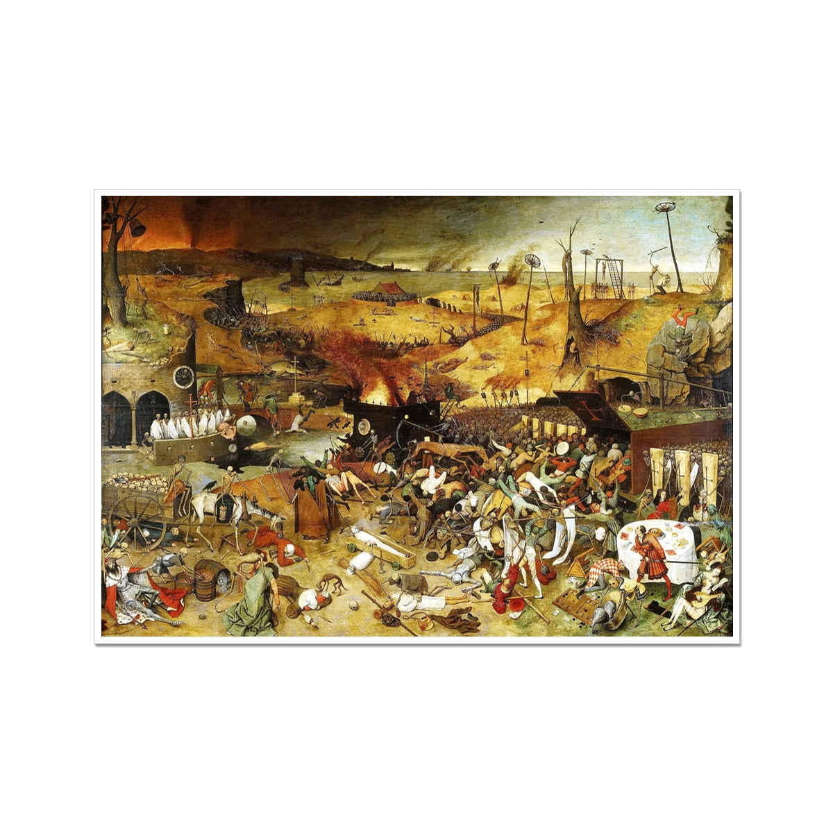 The Triumph of Death, was created by Pieter Bruegel the Elder around 1562. It is a grim, panoramic depiction of death and devastation, showing an apocalyptic landscape where skeletal figures, symbolizing death, dominate and torment the living. The scene is chaotic, with skeletons wielding weapons and tools as they massacre people from all walks of life—peasants, nobles, and clergy alike. The dead are shown in various macabre activities, such as herding people into a coffin, attacking soldiers, and dragging victims away.