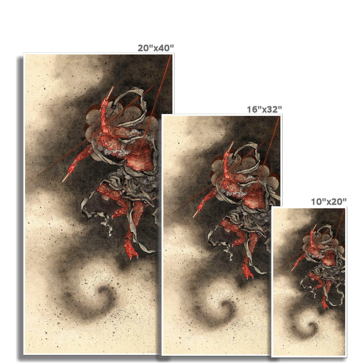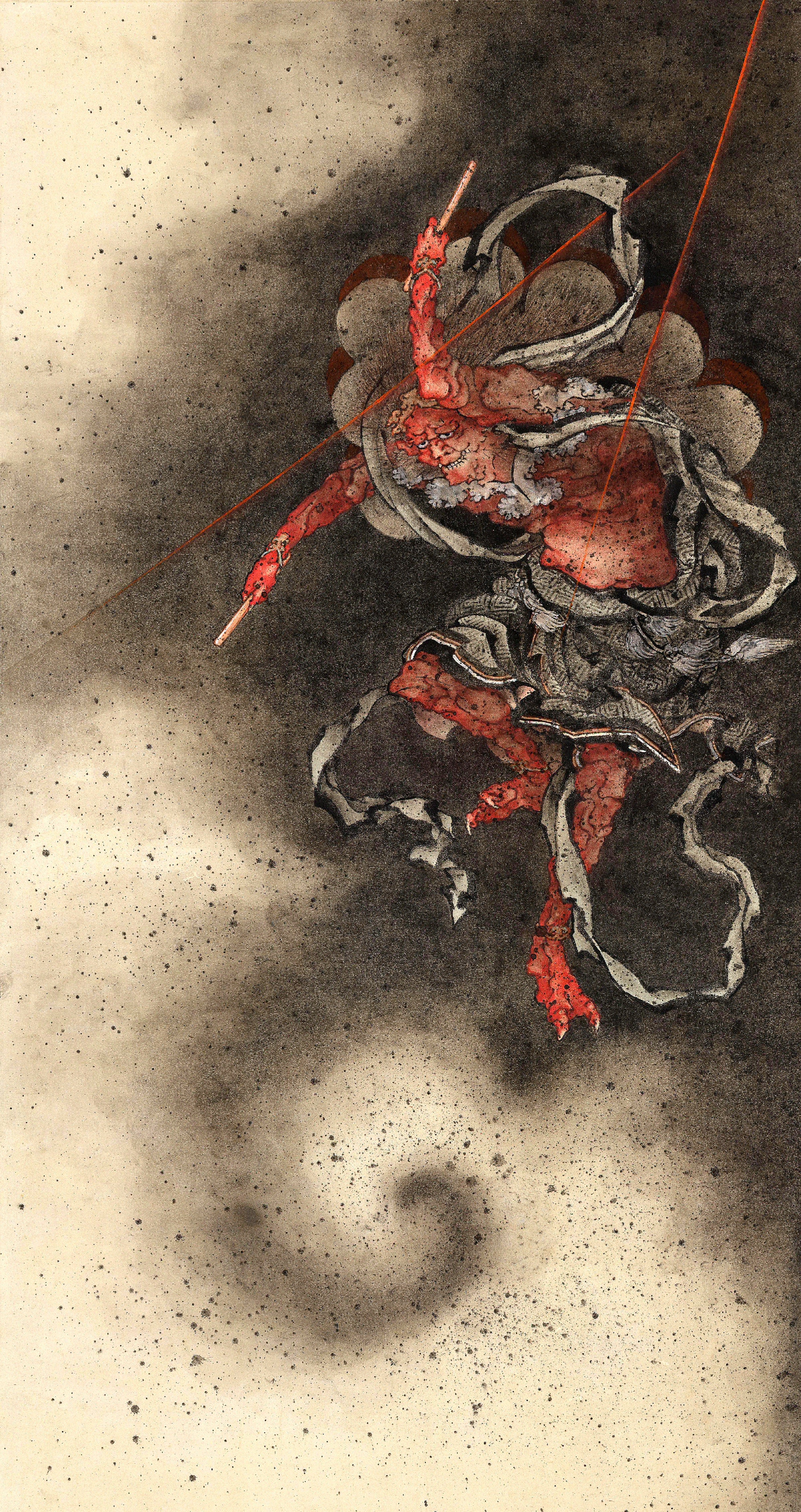 Thunder God (c.1840) by Katsushika Hokusai presents a ferocious vision of the Shinto deity Raijin, suspended amid swirling clouds and charged atmosphere. Rendered with explosive energy, the contorted figure beats his drums of thunder, streaked with jagged lines of lightning and violent motion. Hokusai’s bold use of ink, texture, and dynamic composition transforms the divine into something elemental and terrifying, capturing nature as a force of chaos, power, and awe rather than harmony.