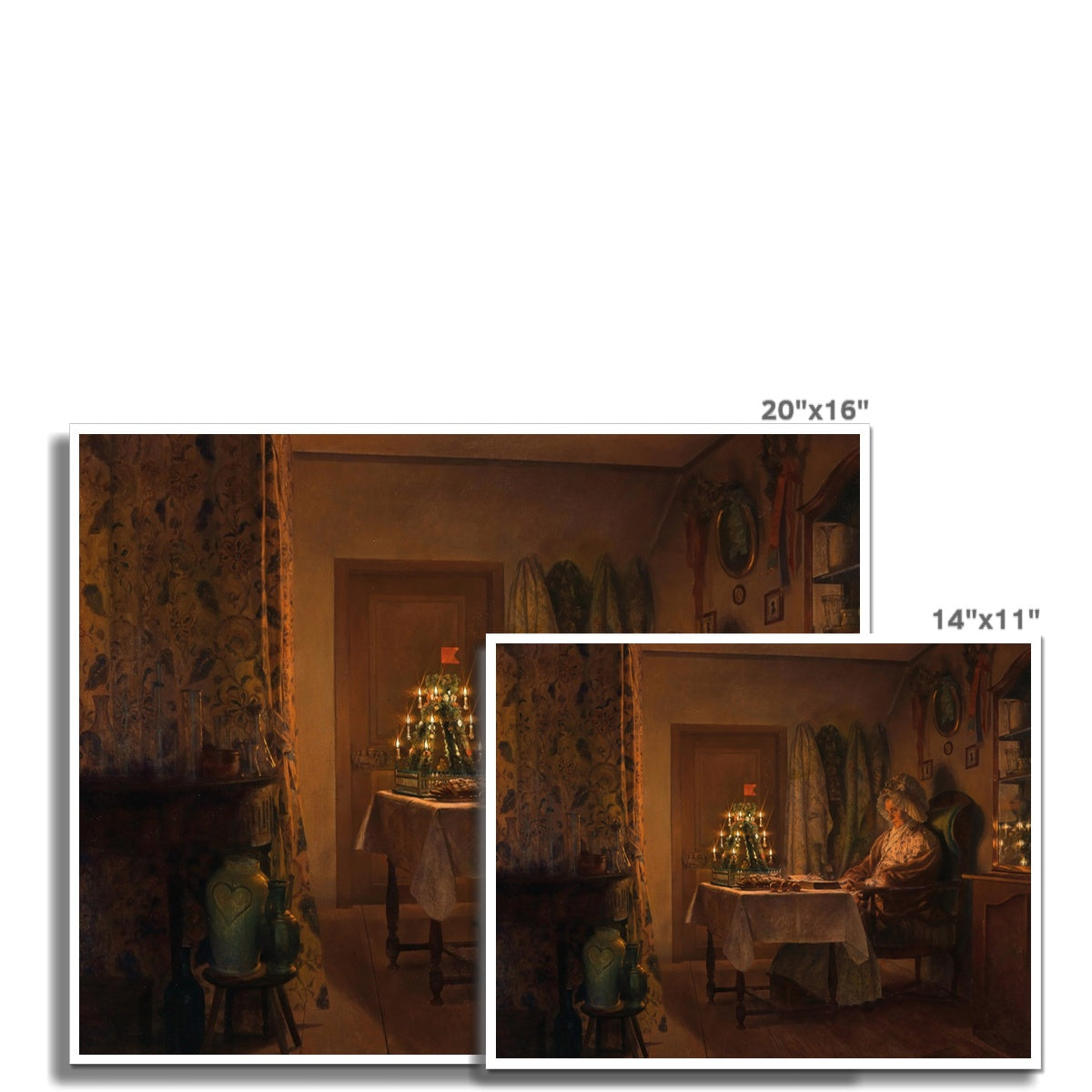 The room is decorated with festive touches, such as wreaths and ribbons, but the overall mood is somber. The soft, warm light contrasts with the shadows, creating a cozy yet melancholic atmosphere. The detailed background, including furniture and household items, adds to the authenticity and intimacy of the scene. This painting effectively conveys the emotional weight of loneliness during a time traditionally associated with joy and togetherness, reflecting the artist's ability to evoke deep feelings through detailed and thoughtful composition.
