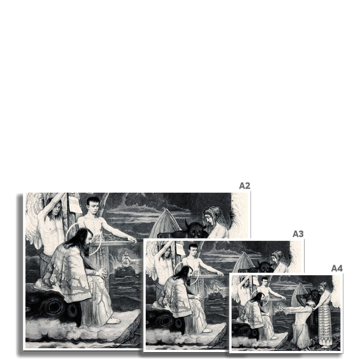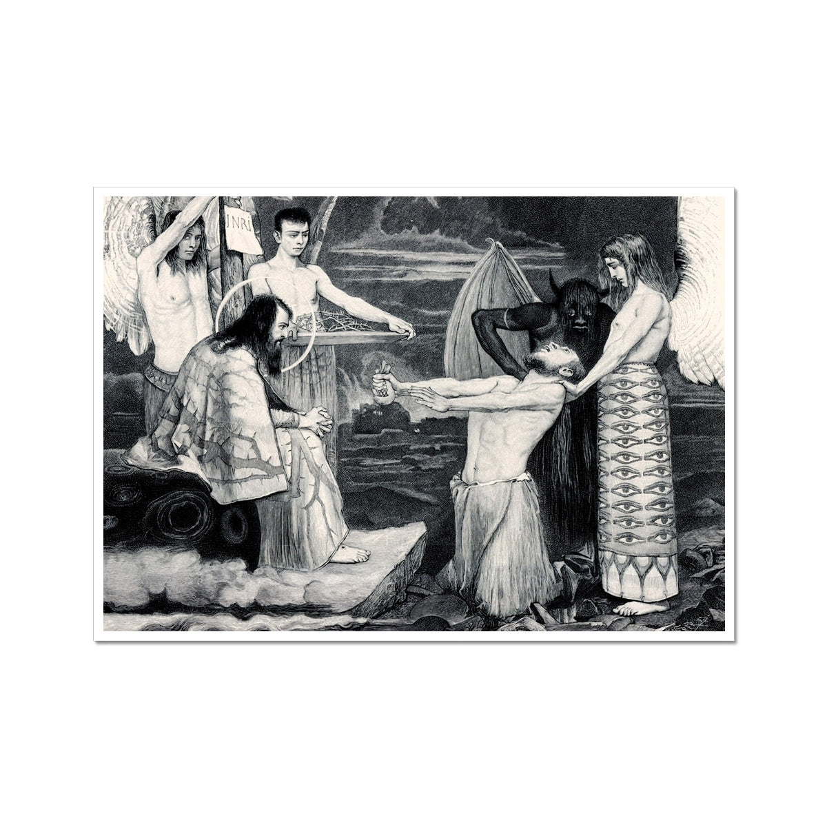 "A Reunion" by Sascha Schneider, circa 1895, is a black-and-white illustration steeped in Symbolist themes and iconography. It depicts a complex, spiritually intense scene involving multiple figures engaged in a mystical ritual or gathering.