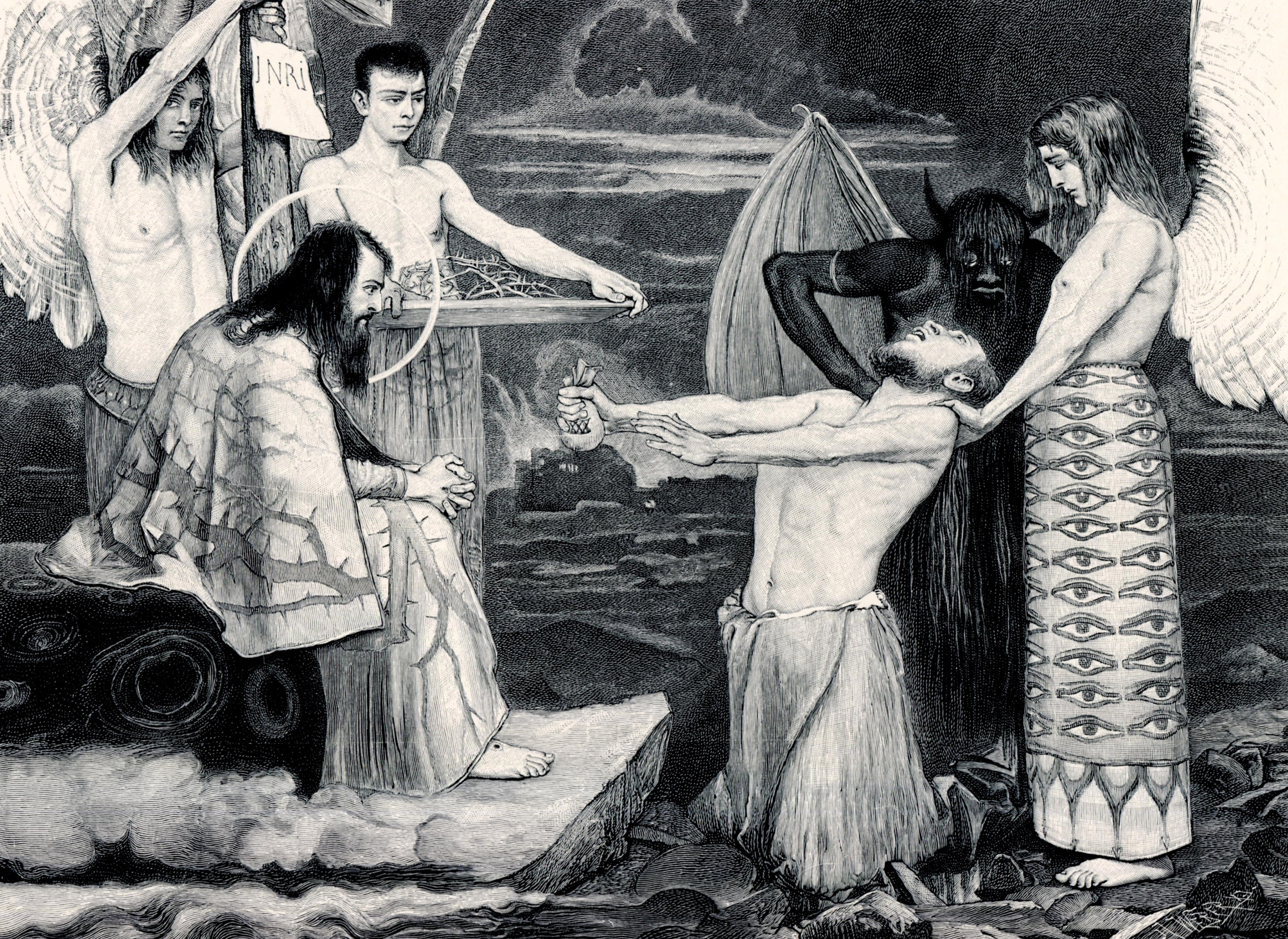 In the center, a haloed figure sits in contemplation or judgement, while other figures surround them in various roles, possibly representing allegorical or supernatural forces. To the right, a winged, angelic figure with eyes embroidered on their garment stands beside a demonic-looking character, who clasps another kneeling figure by the neck, suggesting a tension between divine and infernal powers. Another figure presents a crown of thorns, while someone holds a banner marked "INRI," hinting at Christian iconography. The dark, cloudy background enhances the eerie, otherworldly mood. The piece combines elements of Christian symbolism, mythological motifs, and psychological conflict, highlighting Schneider's fascination with the dichotomy of good and evil, power, and submission.