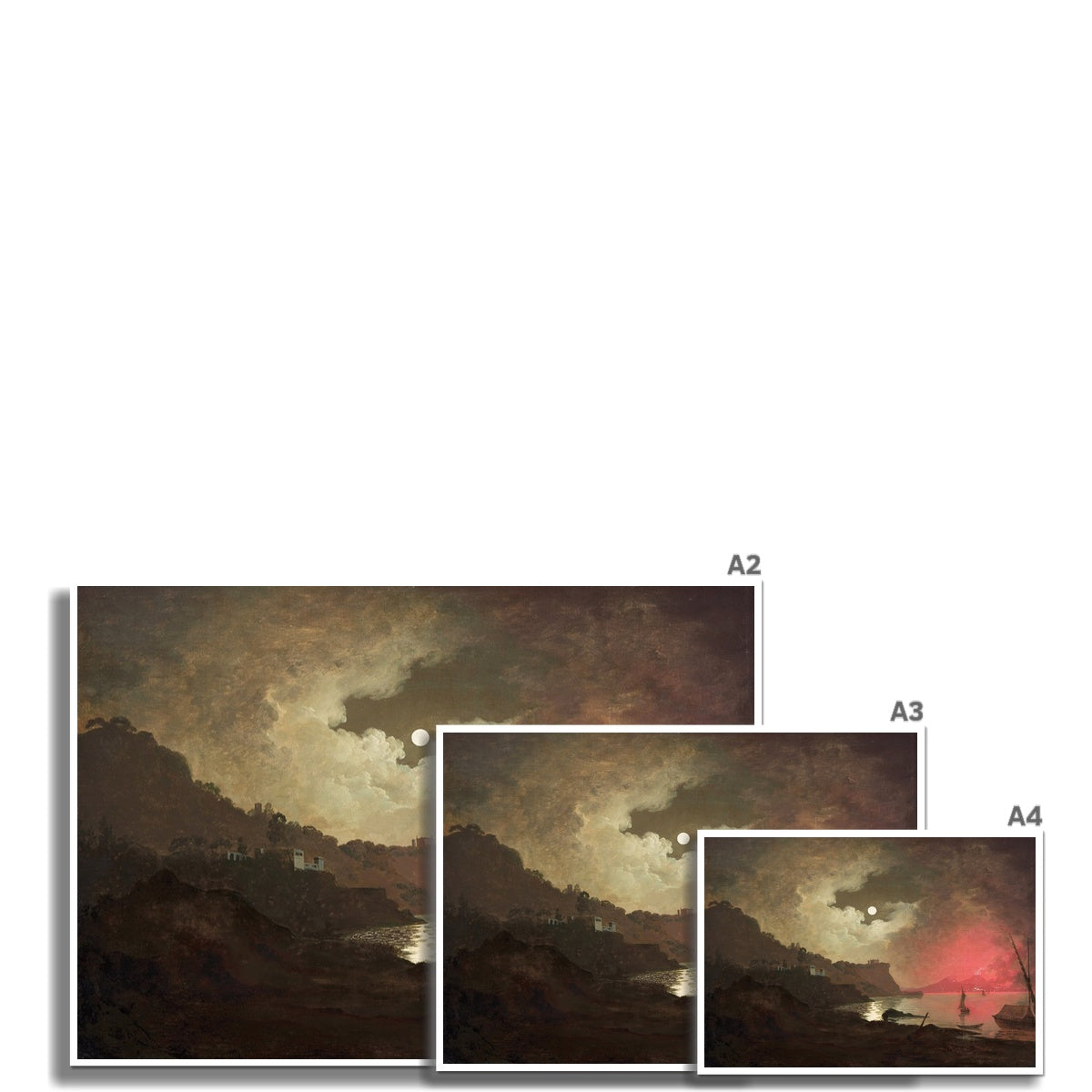 "A View of Vesuvius from Naples" is a painting by English artist Joseph Wright of Derby, created in 1790. It depicts the city of Naples with Mount Vesuvius in the background, casting a glow over the city at night. The painting shows the bustling harbour, with boats and ships, as well as the illuminated city. The painting showcases Wright's skill in capturing the dramatic effect of light, both natural and artificial, and conveys a sense of the energy and activity of the city. The painting is considered an important work in the artist's oeuvre and reflects the growing fascination with the natural world and its power during the Enlightenment era.