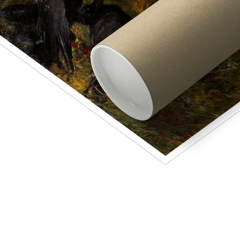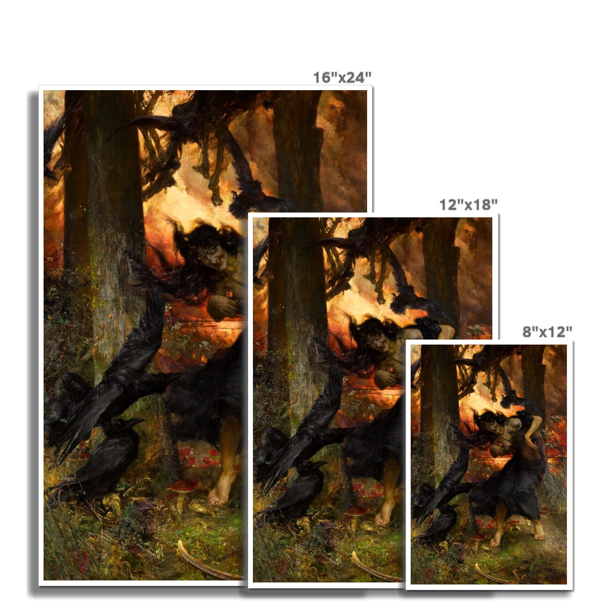 "A Witch" by Edgar Bundy, painted in 1896, depicts a dark and eerie scene set in a dense forest. The central figure is a wild-eyed, dishevelled witch, draped in tattered black clothing. She stands barefoot on the forest floor, amidst overgrown foliage and vibrant red mushrooms. Black crows surround her, some in flight and others perched on the ground, adding to the sinister atmosphere. The background is ablaze with an orange and yellow glow, suggesting either a setting sun or a supernatural fire. The witch's intense expression and the dynamic movement of the crows create a sense of chaos and malevolence.