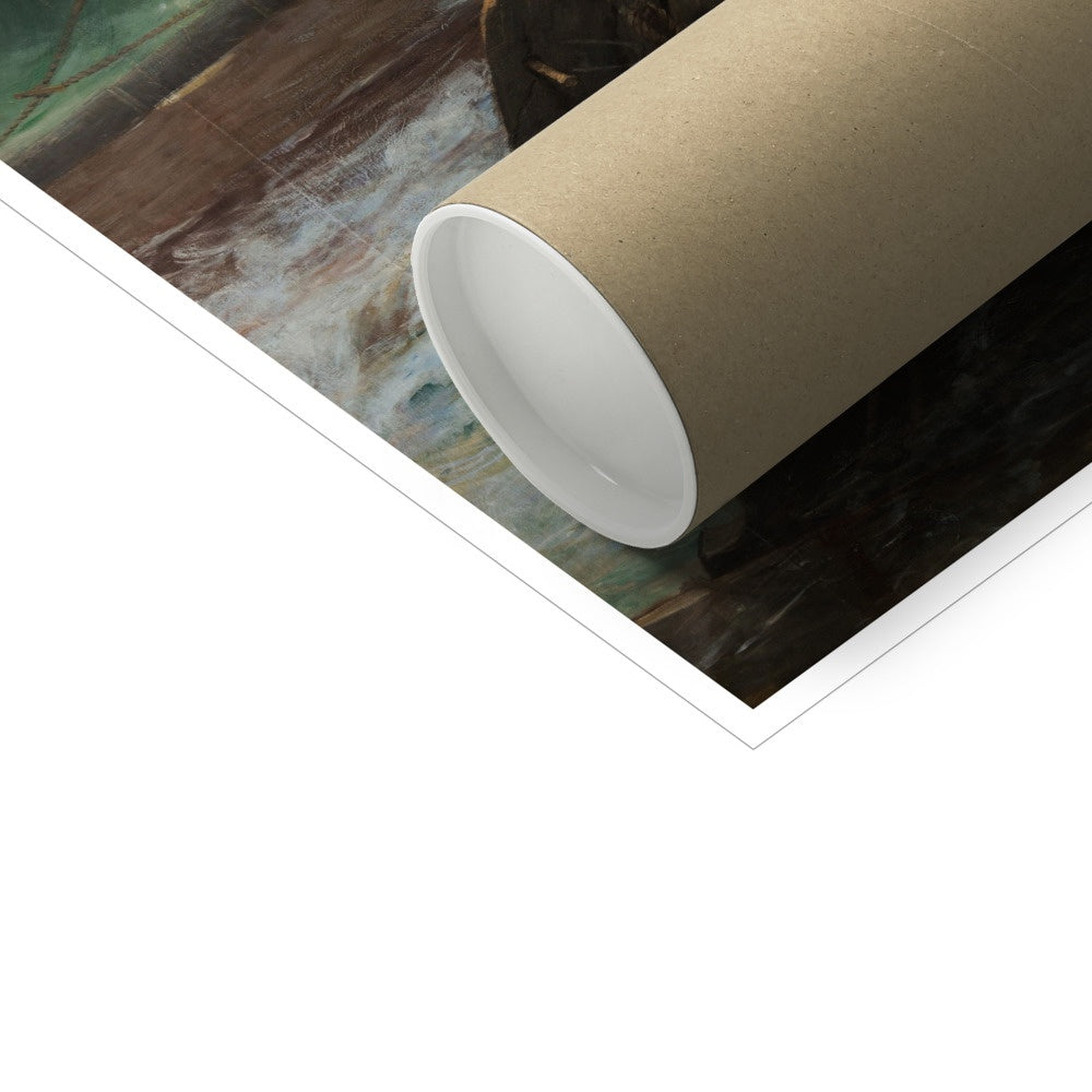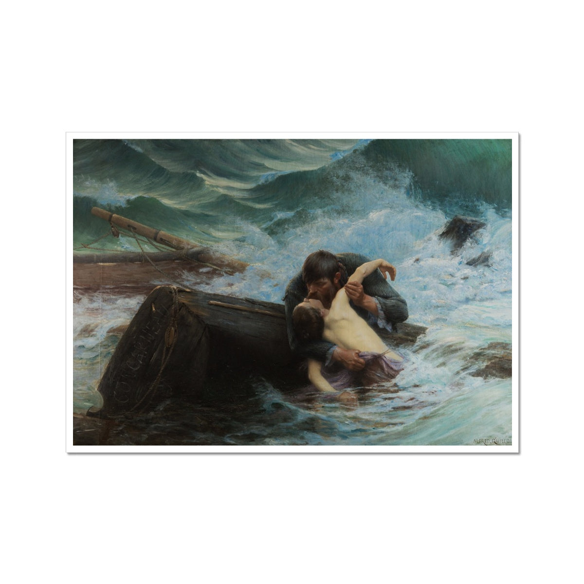 In Adieu!, Alfred Guillou portrays a heart-wrenching moment as a fisherman desperately clutches a lifeless figure amidst the wreckage of a shipwreck. The powerful waves and dramatic sky heighten the scene's emotional intensity, reflecting themes of tragedy, love, and human vulnerability against the overwhelming forces of nature.