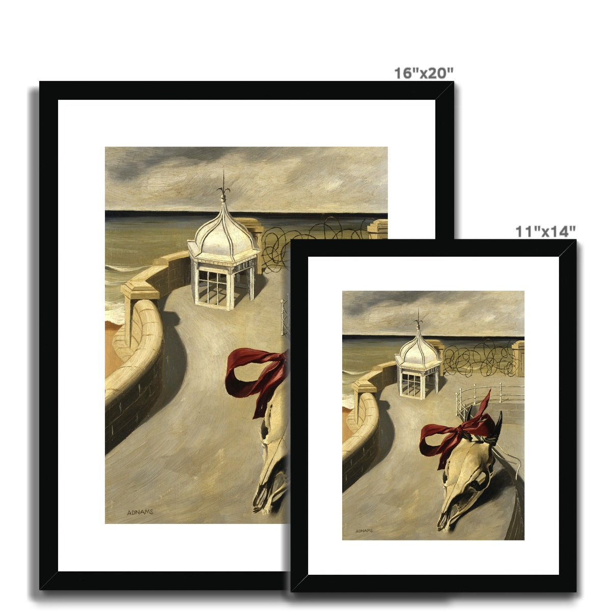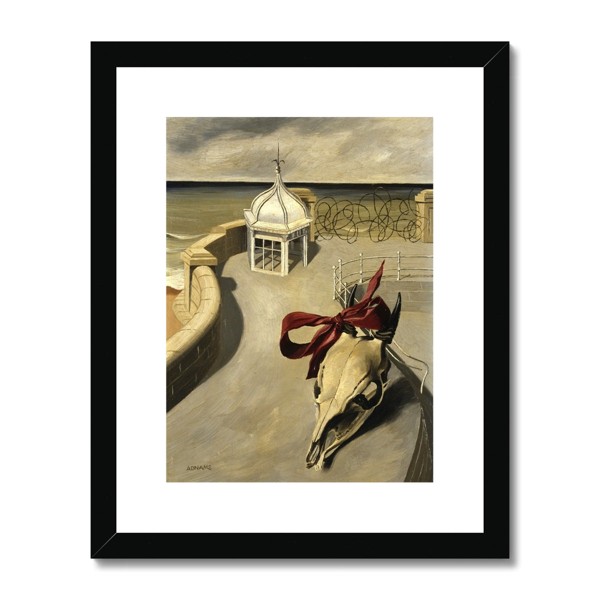 In this haunting surrealist composition, Adnams presents a desolate coastal promenade where a bleached animal skull, adorned with a vivid red ribbon, lies against the cold geometry of stone and sea. The empty pavilion and swirling ironwork suggest an eerie stillness after destruction, blending beauty and decay in equal measure. Painted in the aftermath of World War II, the work reflects both personal and collective desolation—an unsettling meditation on survival, memory, and the fragility of life amidst ruin.