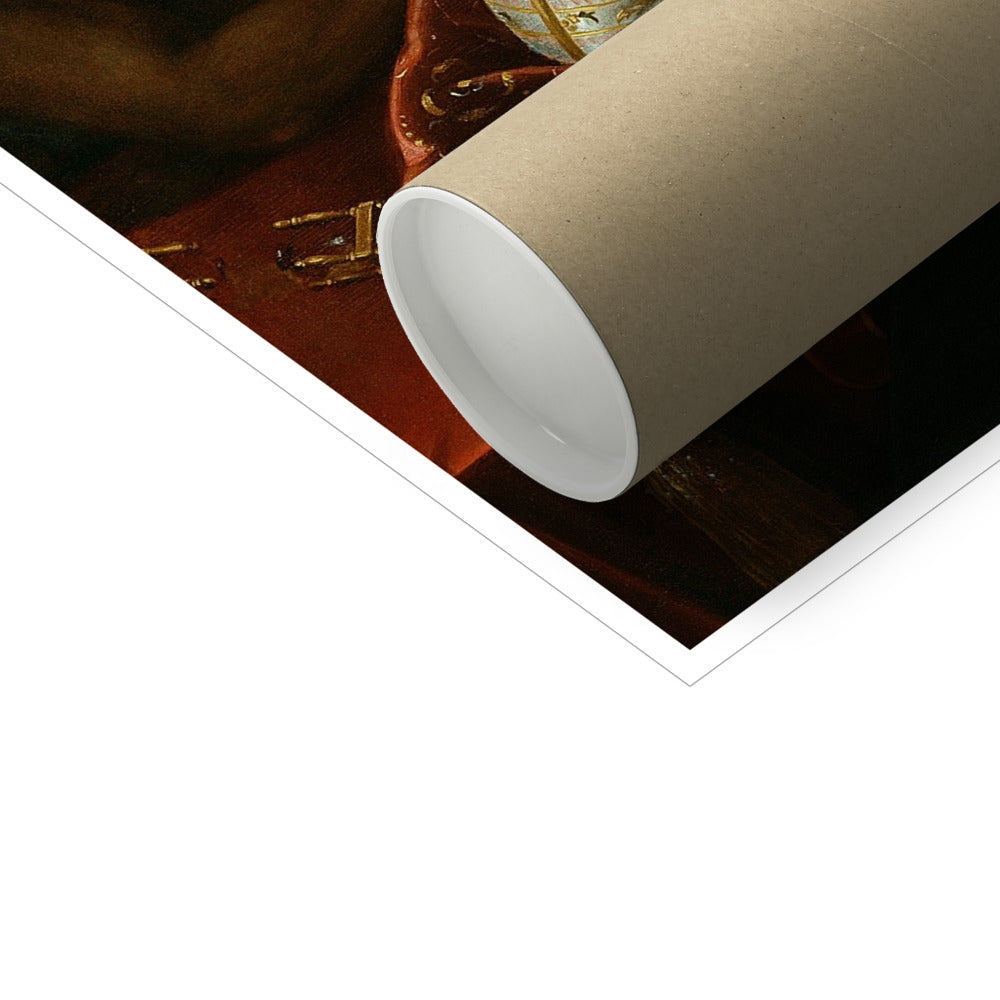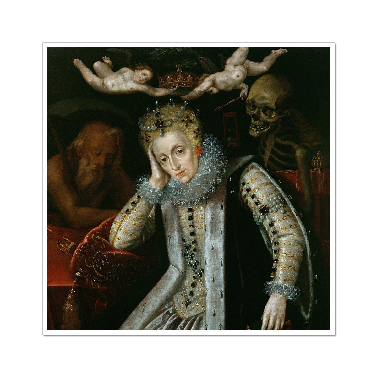 To the right of Elizabeth stands a skeletal figure, representing death, holding an hourglass, a reminder of the inevitability of mortality. The juxtaposition of the Queen with the figure of death highlights the transient nature of earthly power and beauty. In the background, an elderly man, often interpreted as Father Time, watches over the scene, reinforcing the theme of the passage of time. This painting is a powerful meditation on the dualities of life—youth and age, power and mortality—and serves as a poignant reflection on Elizabeth I’s reign as she approached the end of her life. The dark, muted colours and the symbolic elements create a somber and contemplative atmosphere, emphasizing the inevitability of time and death even for a monarch.