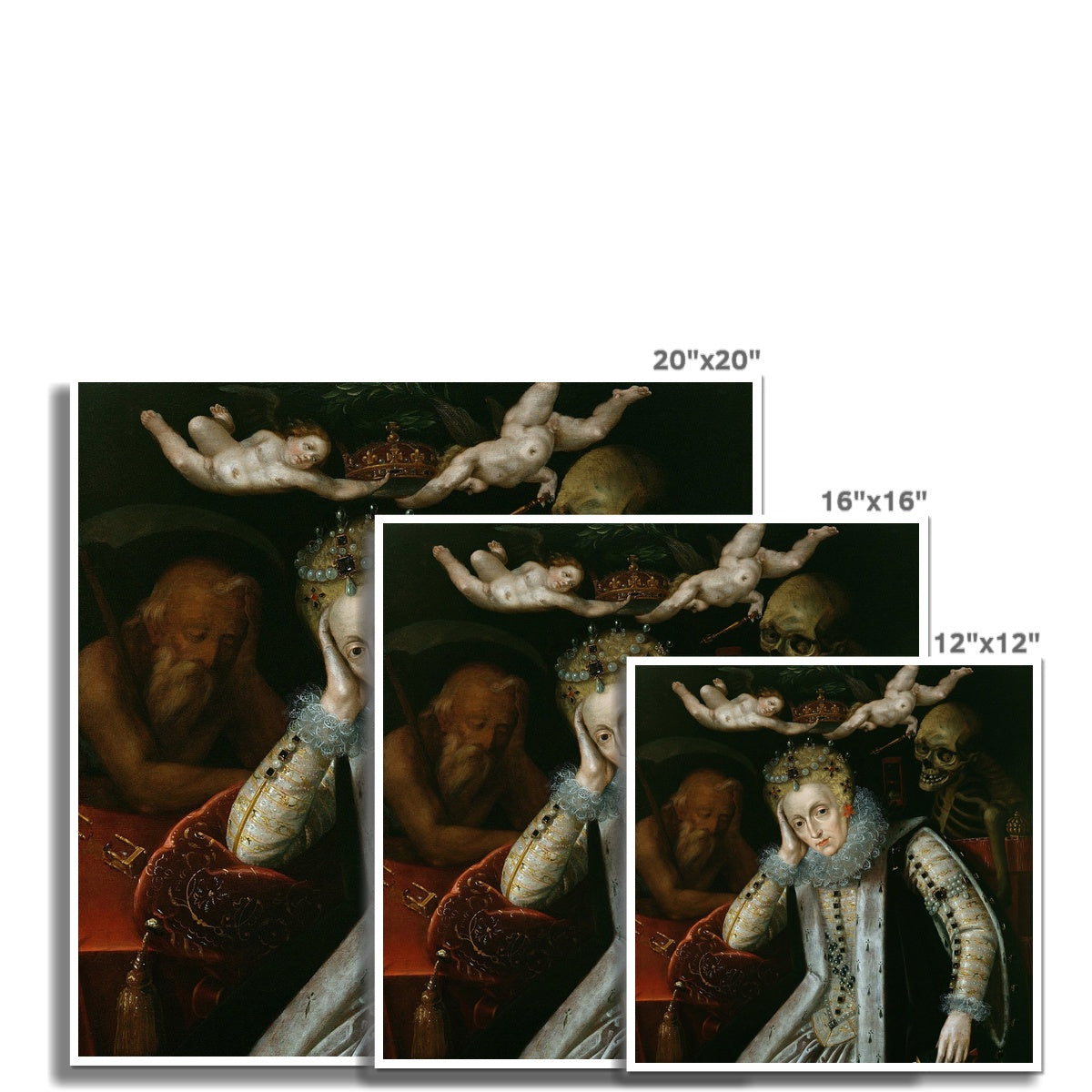 The "Allegorical Portrait of Elizabeth I," painted around 1610, is a symbolic representation of Queen Elizabeth I of England. This portrait is rich in allegory and conveys the themes of time, mortality, and the fleeting nature of power. The Queen is depicted in elaborate, regal attire, adorned with pearls and jewels, which symbolize purity and the wealth of her reign. Her expression is somber and reflective, with her head resting on her hand, suggesting contemplation or melancholy. Above her, two cherubs hold a crown over her head, signifying her royal status and divine right to rule.