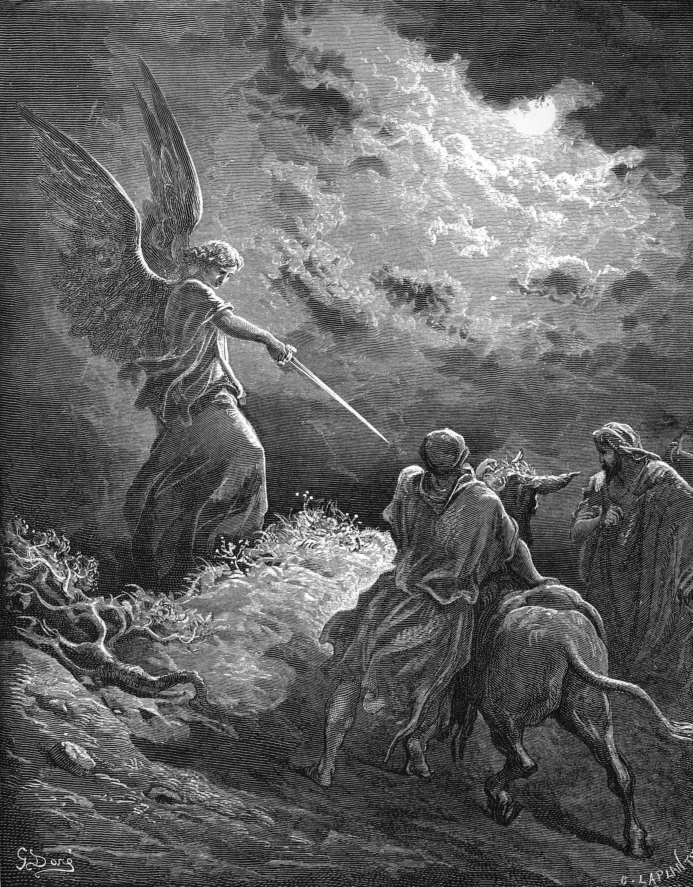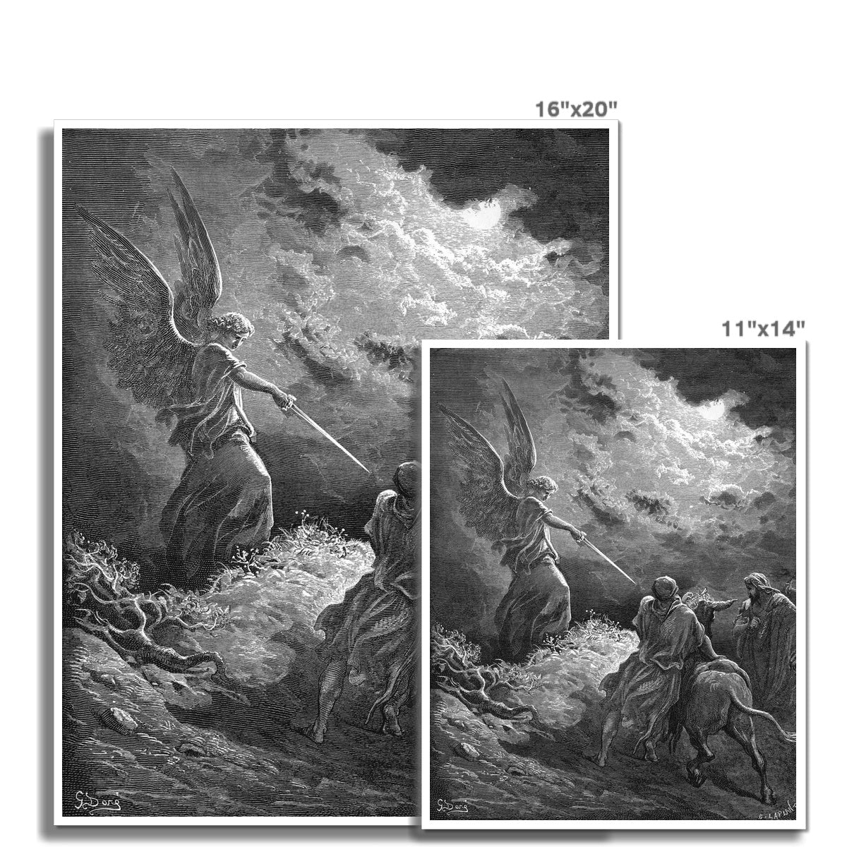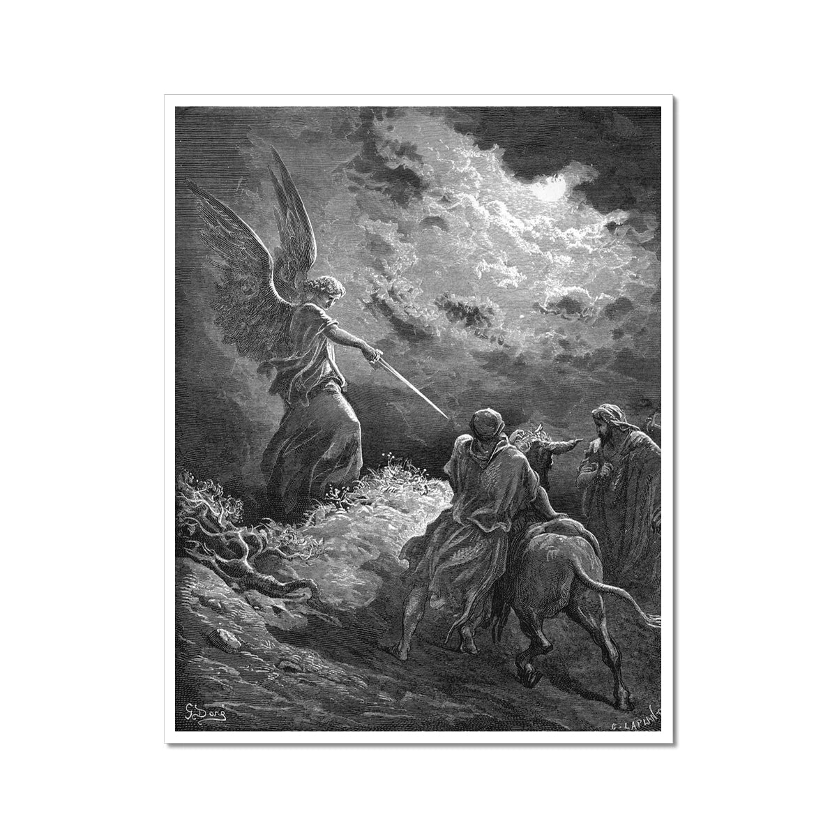 This illustration by Gustave Doré, titled "The Angel Appears to Balaam," created around 1866, is a detailed engraving that depicts a biblical scene from the Book of Numbers in the Old Testament.