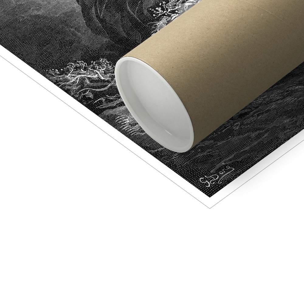 In this dramatic and dynamic illustration, an angel stands with a sword drawn, blocking the path of Balaam, who is riding a donkey. The angel, emanating a divine and authoritative presence, is depicted with large, majestic wings and flowing robes. Balaam, with a look of astonishment and fear, is turned towards the angel. His donkey appears alarmed, adding to the tension of the moment. The background features a turbulent sky, illuminated by the light of the moon breaking through the clouds, enhancing the mystical and foreboding atmosphere. The intricate details and the use of light and shadow typical of Doré’s work bring the scene to life, highlighting the confrontation and the divine intervention.