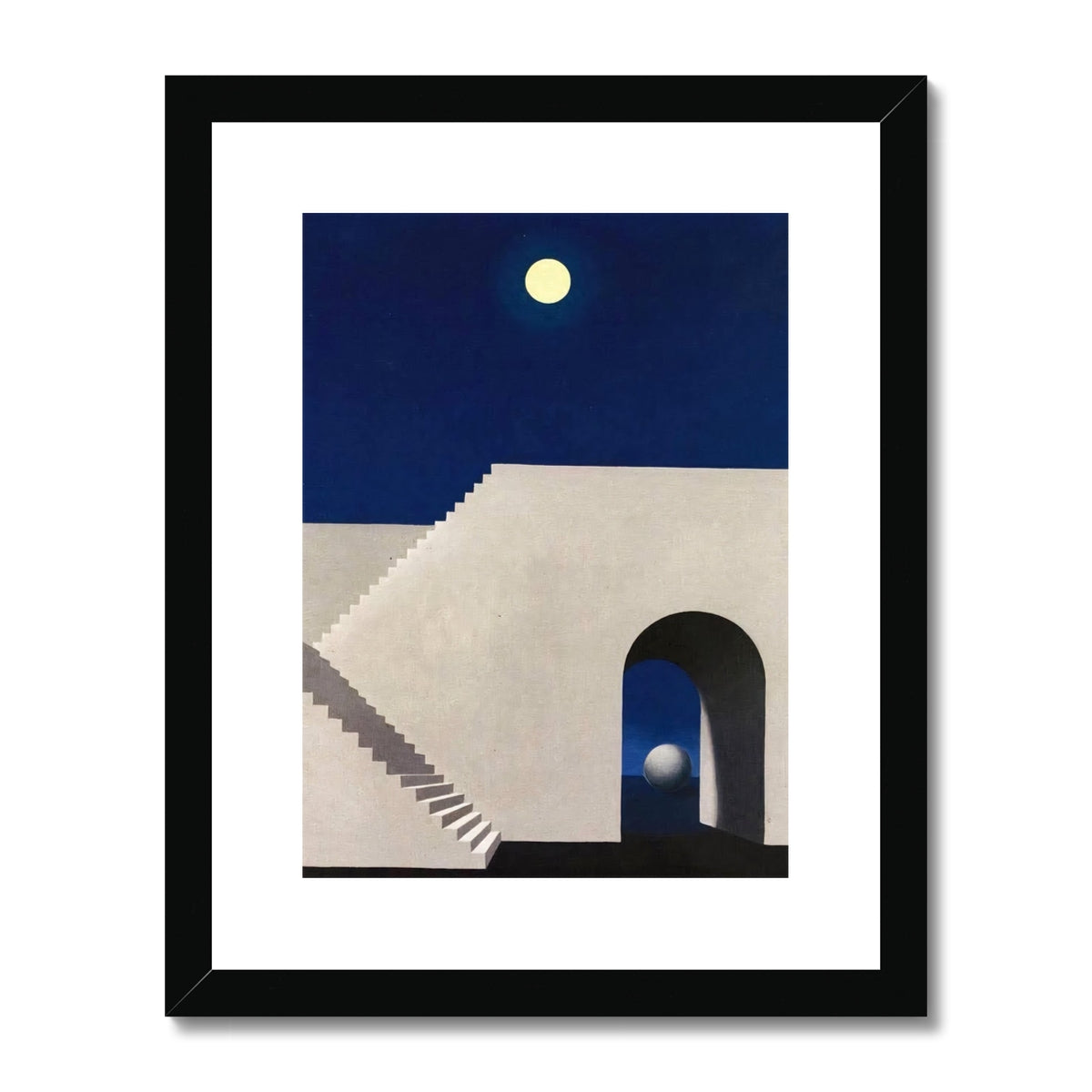 "Architecture in the Moonlight" (1956) by René Magritte is a surreal and minimalistic painting that explores the quiet mystery of architectural forms under the spell of moonlight. In this dreamlike composition, stark geometric structures—staircases, archways, and a lone sphere—stand frozen in a silent, nocturnal landscape. The full moon glows against a deep indigo sky, casting soft, uncanny shadows that heighten the sense of stillness and enigma. Magritte’s precise, almost illusionistic style contrasts with the ambiguity of the scene, evoking metaphysical contemplation and the surreal beauty of the ordinary made strange.