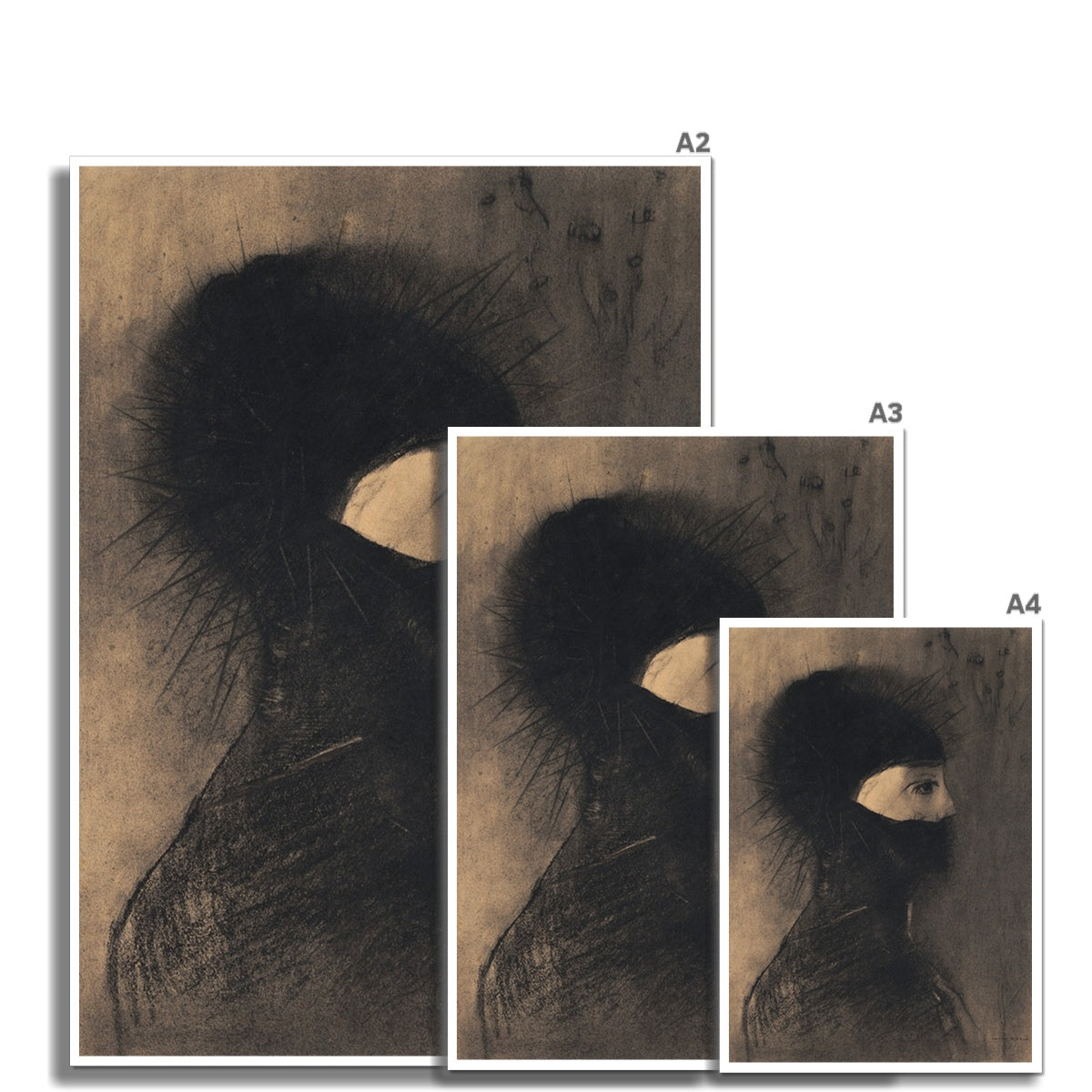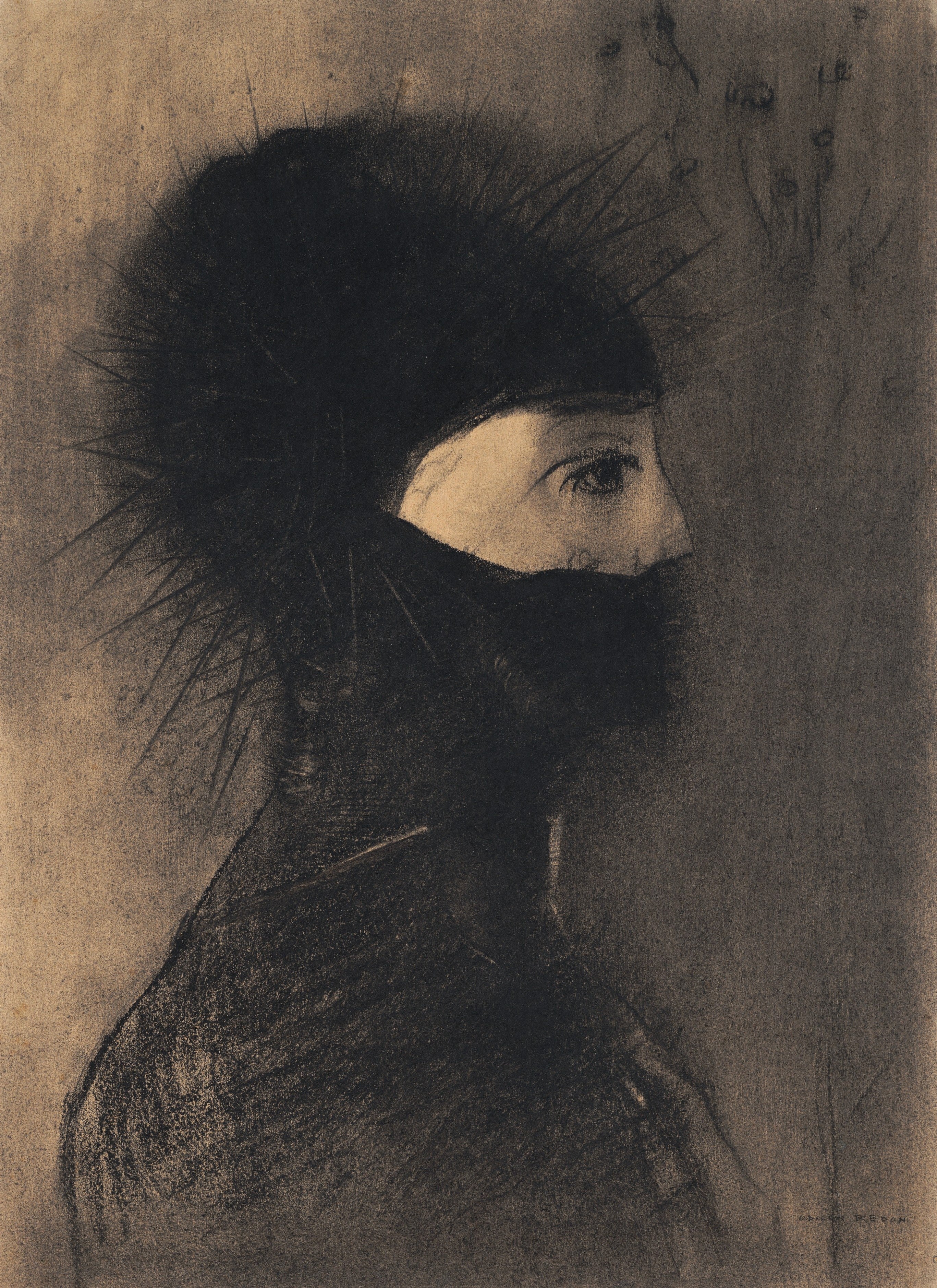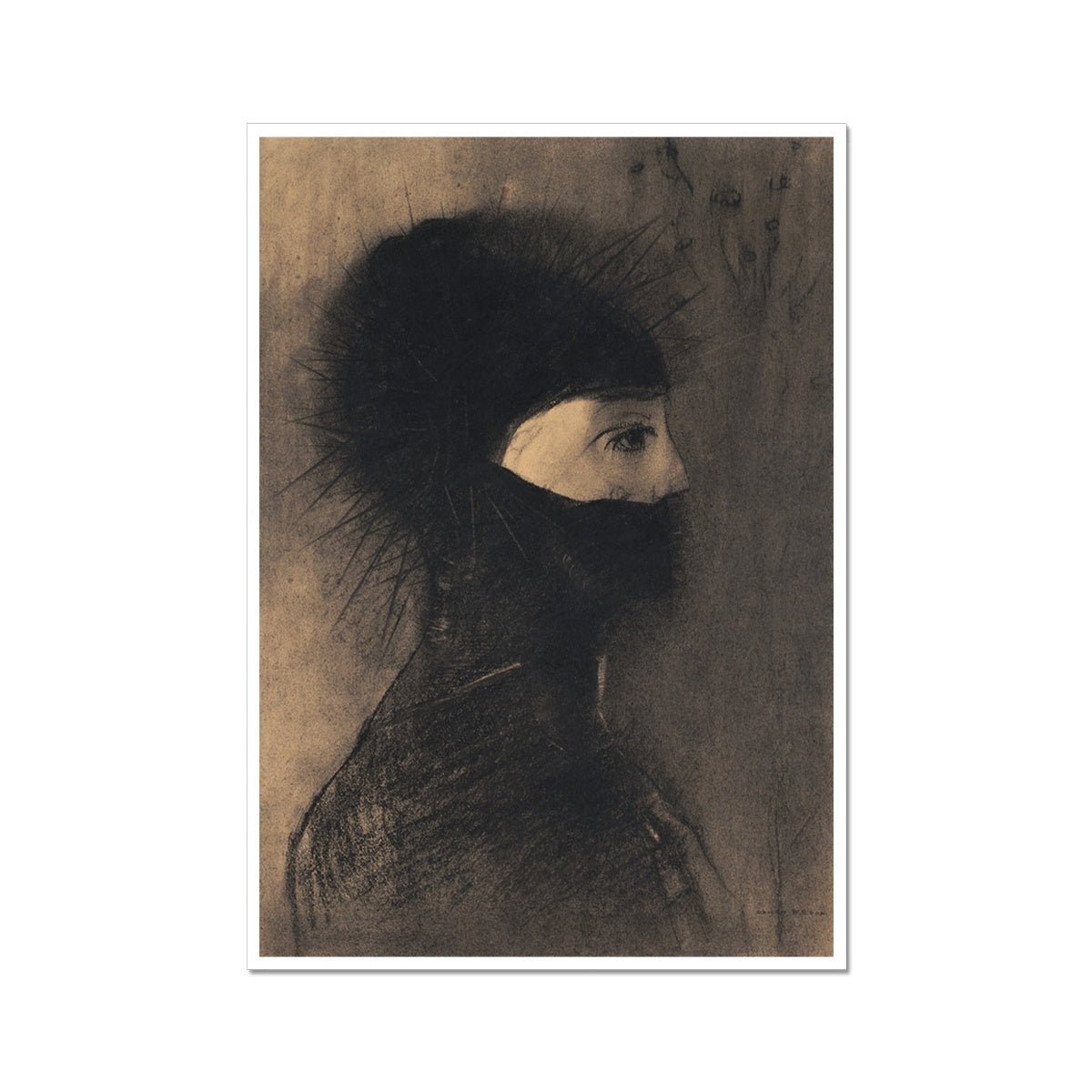 The piece "Armor" by Odilon Redon, dating from around 1891, is a study in contrasts and textures that evokes a sense of mystery and introspection. The image is dominated by a profile view of a figure, partially obscured by what appears to be a dark, textured helmet or headpiece, which could be interpreted as armor. The use of shadow and light is stark, highlighting the figure's eye and giving depth to the image. The somber tones and the obscured face suggest themes of isolation, protection, or perhaps the concealment of one's true identity. Redon's work often delves into the realm of the imagination and the subconscious, and this piece may reflect those interests, offering a visual metaphor for psychological depth and complexity.