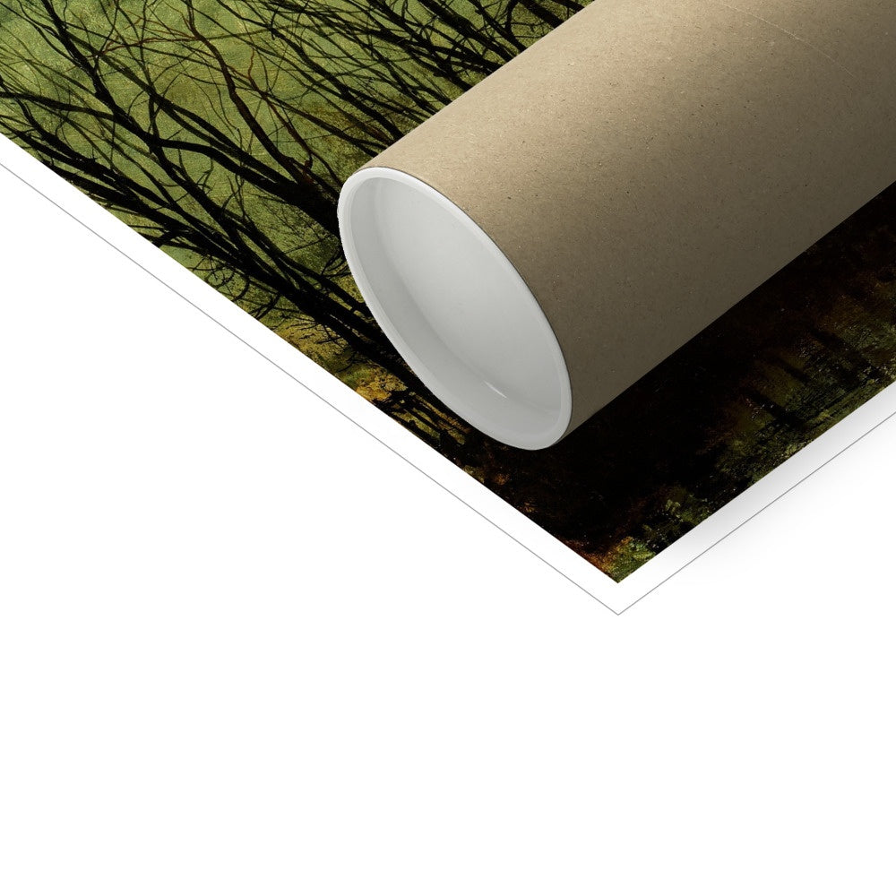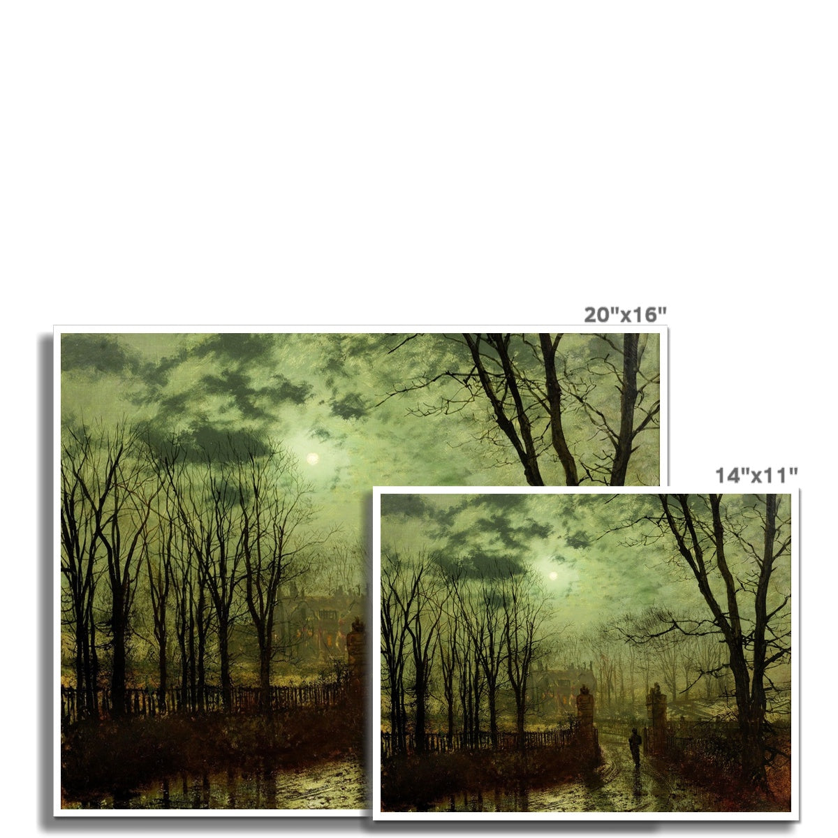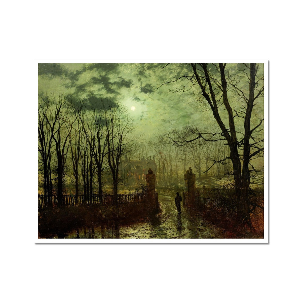 "At the Park Gate" by John Atkinson Grimshaw, circa 1878, captures a serene yet eerie nighttime scene. The painting features a gated entrance to a park, with a lone figure standing before it. The sky is filled with clouds, partially illuminated by the moon, casting a pale, greenish glow over the landscape. Bare trees line the pathway, creating stark silhouettes against the moonlit sky. In the background, a grand house with lit windows is faintly visible through the trees, adding a touch of warmth to the otherwise cool and somber scene. Grimshaw's masterful use of light and shadow, combined with his attention to detail, evokes a sense of mystery and quietude.
