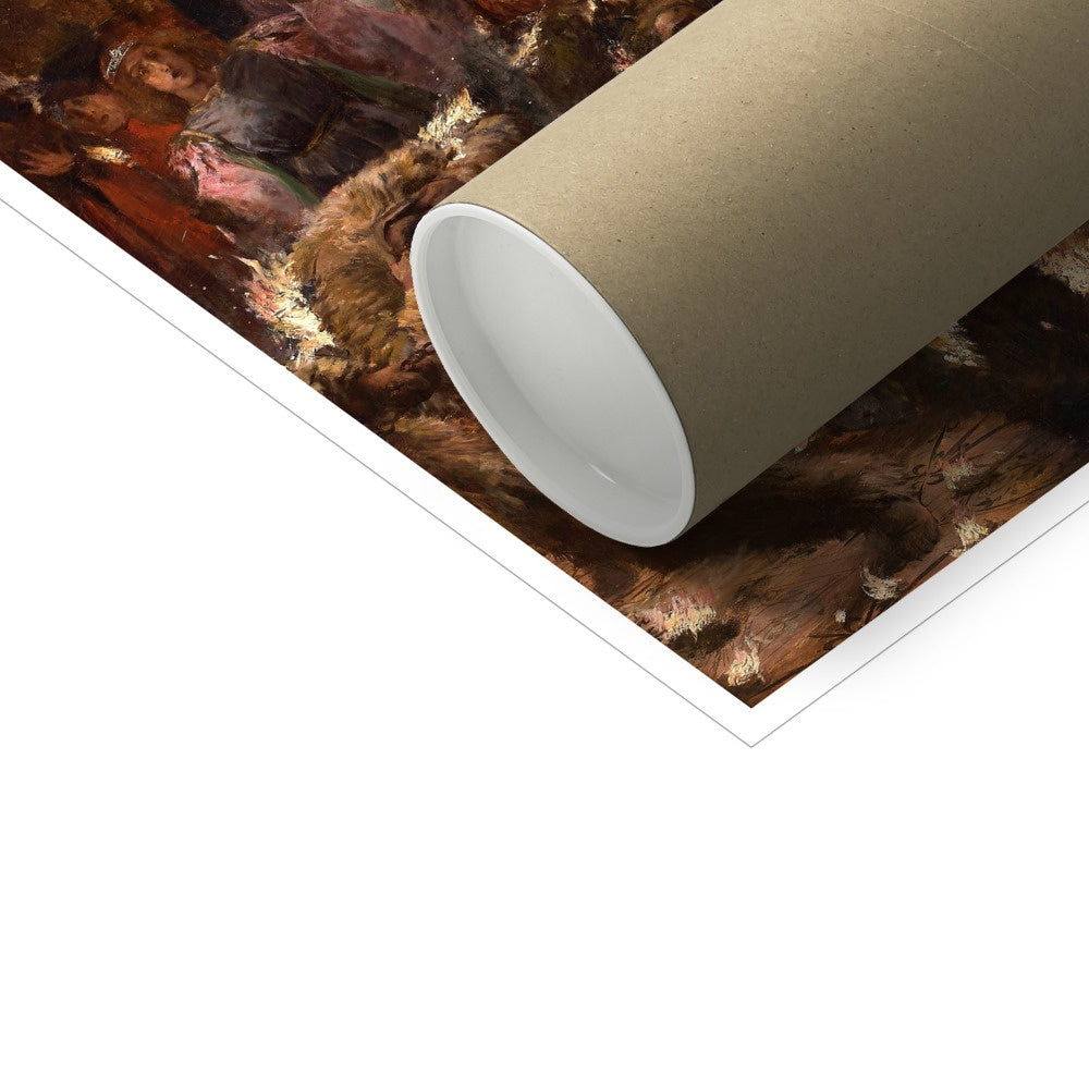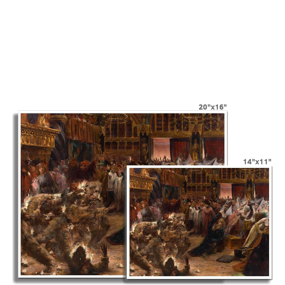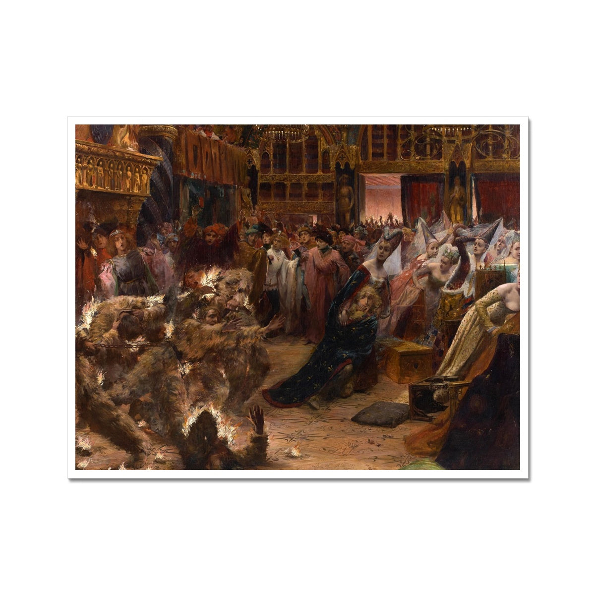 The painting "Ball of the Burning Men" by Georges Rochegrosse is a vivid and dramatic depiction of a historical event. In this painting, Rochegrosse captures the chaos and horror of the Bal des Ardents, a masquerade ball at the French court in 1393 where a tragic fire broke out. The scene is filled with richly dressed nobles in a state of panic as flames consume the costumes of several dancers who dressed as "wild men" with outfits made of flammable materials. The luxurious interior of the court contrasts starkly with the terror and confusion of the incident. The artwork is characterized by its dynamic composition, intense emotion, and the artist's detailed and sumptuous rendering of textiles and expressions.