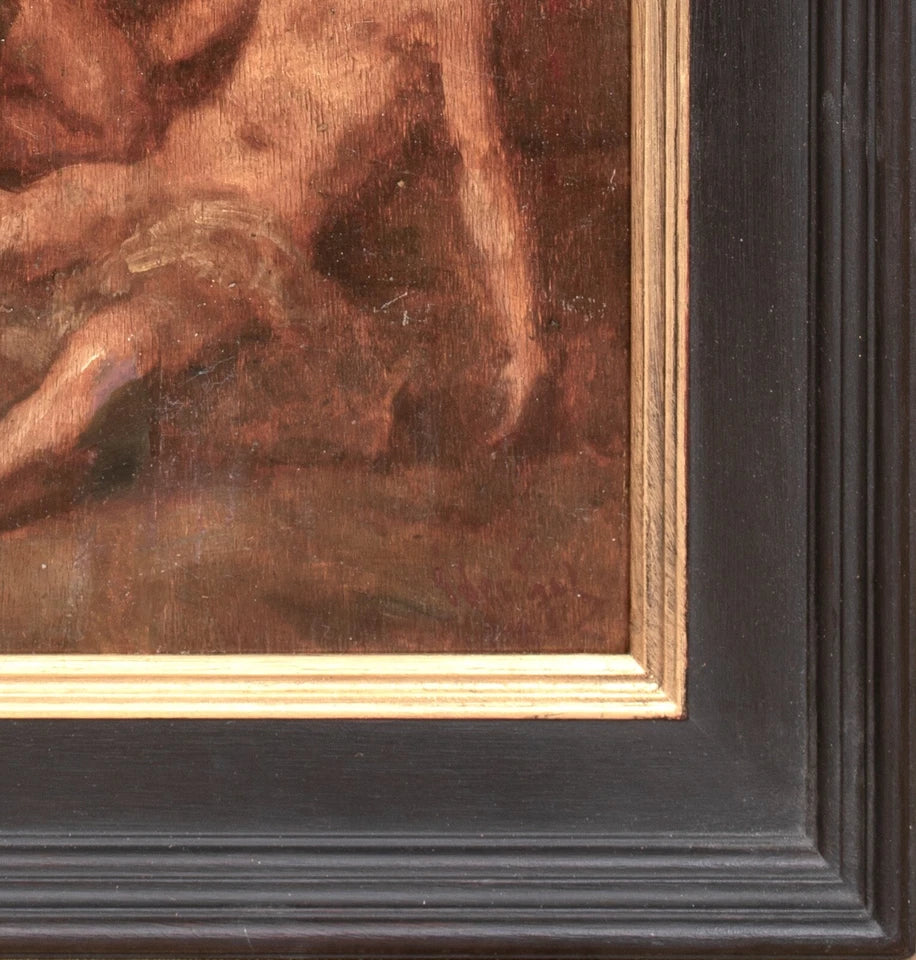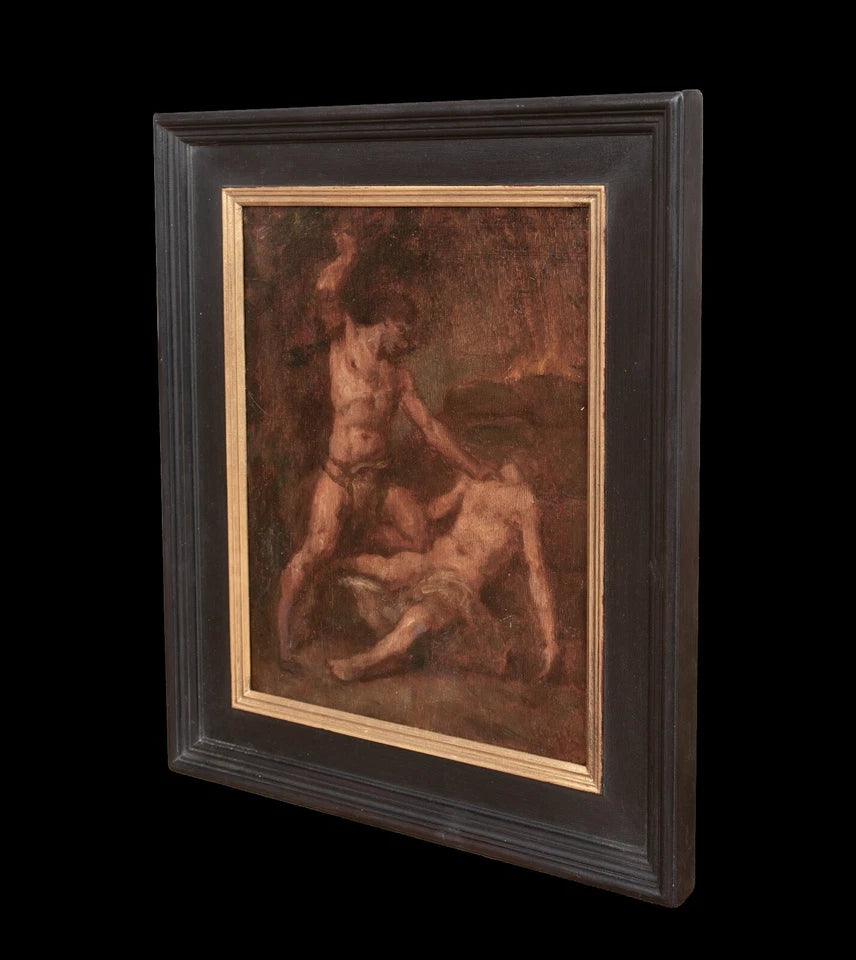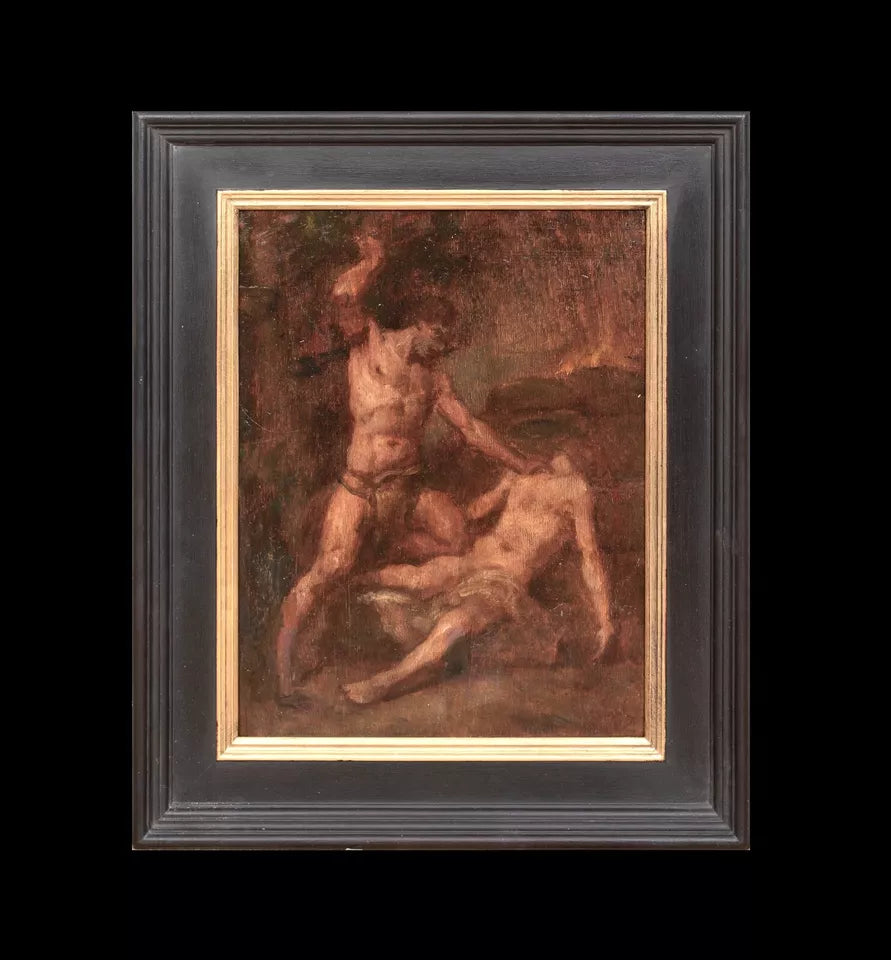 A refined 19th-century French depiction of Cain and Abel, executed in oil on panel. This compelling biblical scene—showing the slaying of Abel by his brother—is rendered with the energetic, expressive brushwork characteristic of Delacroix’s circle, suggesting it may have been conceived as a preliminary study. The work remains in excellent condition and is presented in an ebonised frame with a gilt slip.