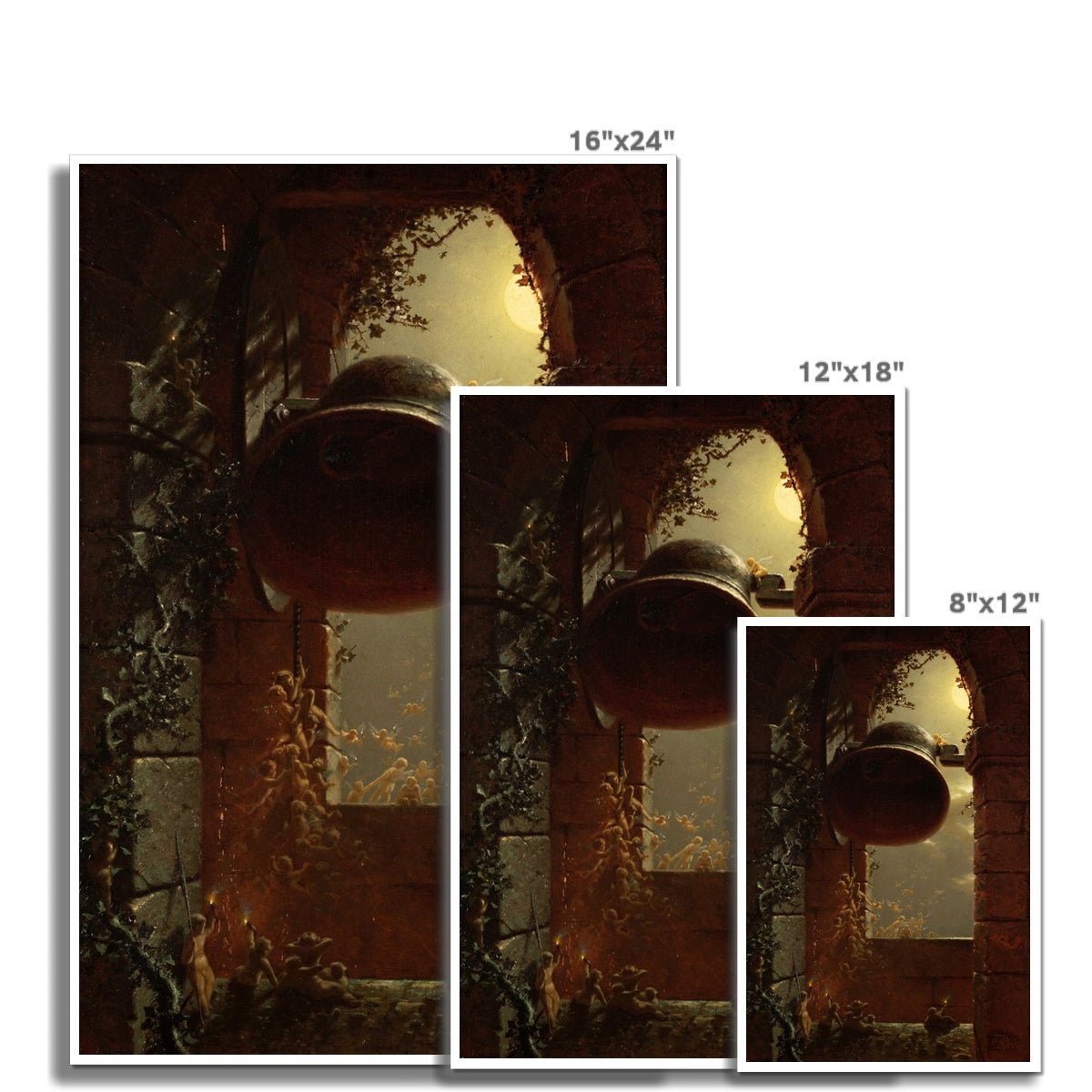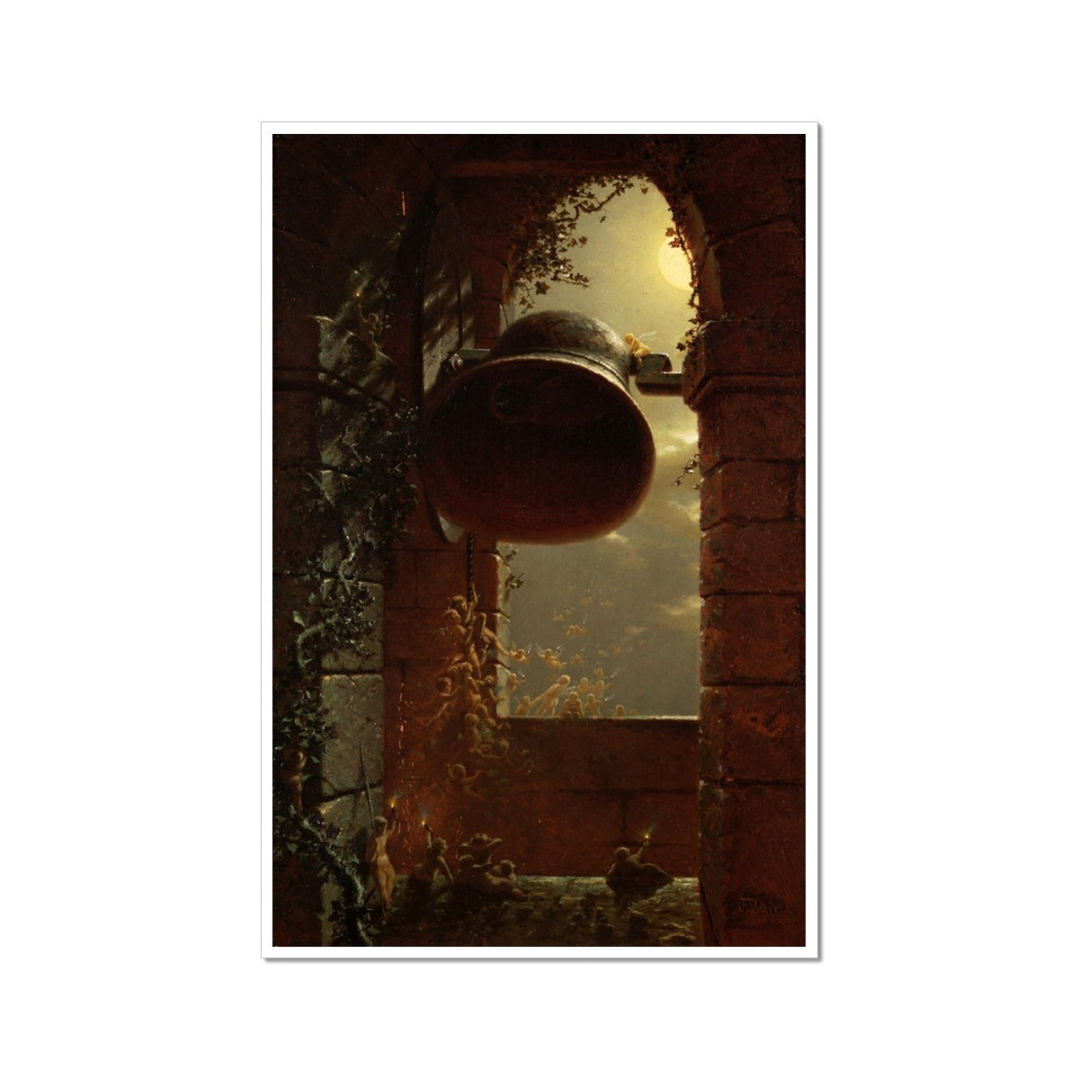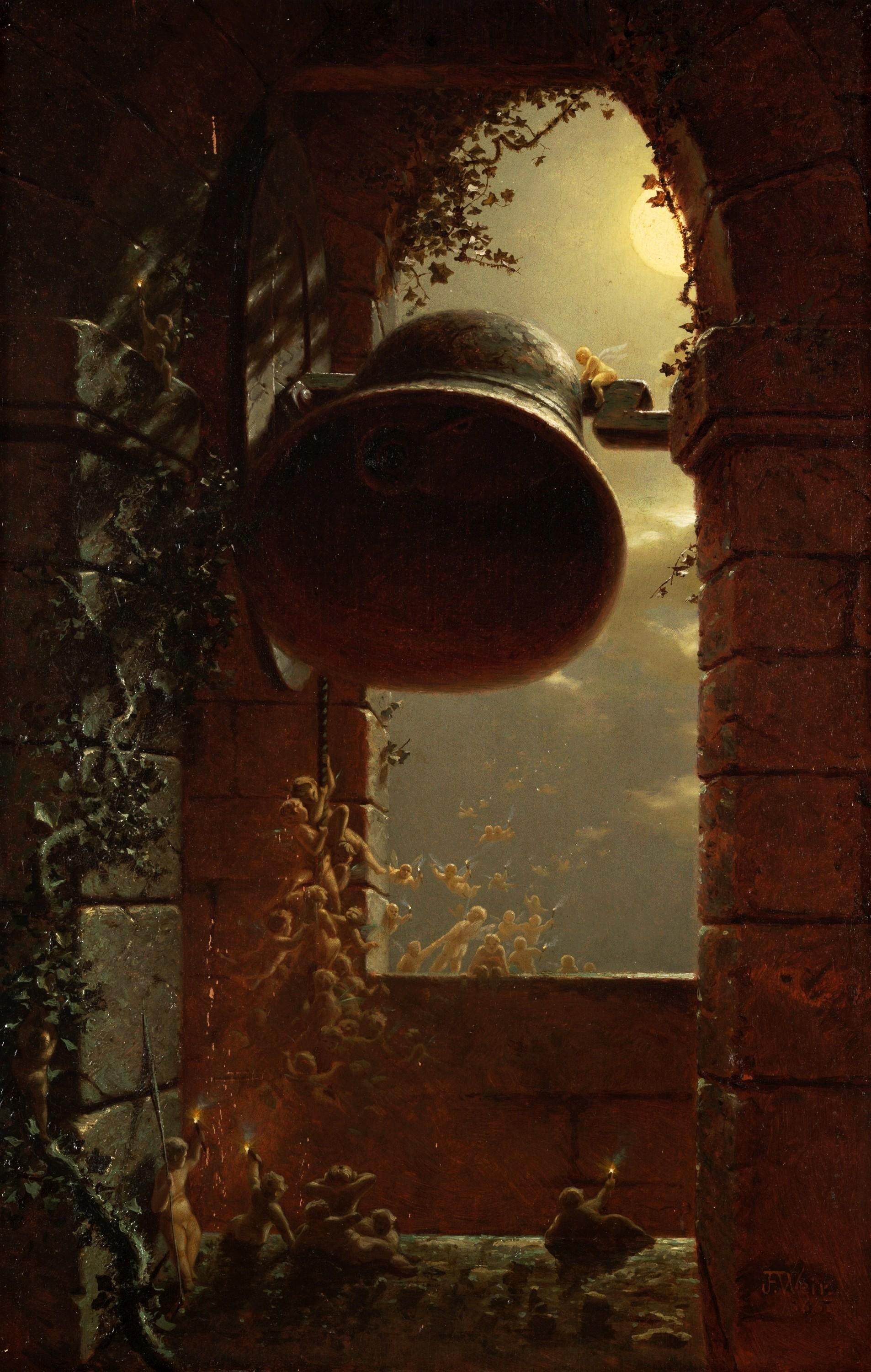 "Christmas Eve" by John Ferguson Weir, circa 1865, is a painting that evokes a mystical atmosphere on a sacred evening. The artwork features a large, central church bell framed within an arched stone window, bathed in the golden glow of a full moon. The moonlight streams through the window, creating a luminous backdrop for the scene. Surrounding the bell, a group of mythical fairies is depicted engaged in various activities, some climbing on the ivy that overruns the old architecture, while others seem to be lighting tiny fires, contributing to the magical feeling of the scene. This blend of the spiritual and the fantastical creates a sense of wonder and nostalgia, characteristic of Weir's artistic style.