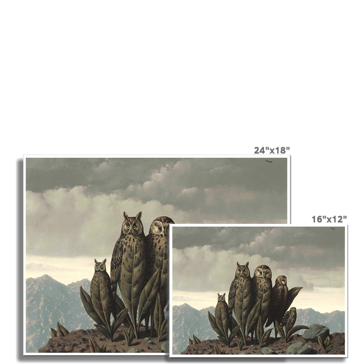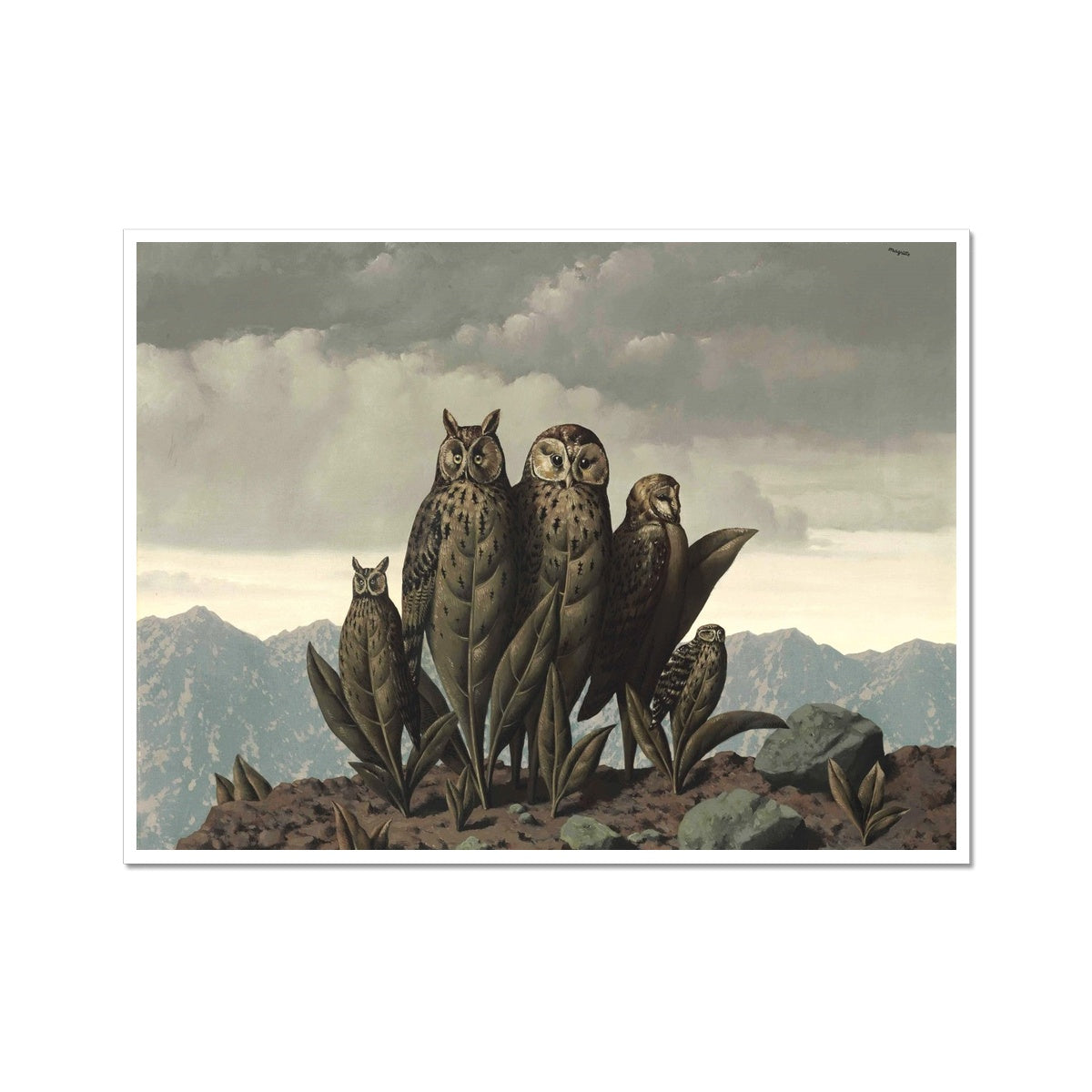 The painting "Companions of Fear" by René Magritte, dating from around 1942, is a surreal composition that places owls, traditionally nocturnal and mysterious birds, within an incongruous daytime setting. Magritte's work often explores the boundaries between reality and the imagined, and in this painting, the owls are depicted standing on two legs and are oversized in comparison to the plant life around them, further enhancing the surrealistic quality of the image. The owls' solemn and penetrating gazes evoke a sense of introspection and contemplation, resonating with the painting's title and suggesting a deeper, possibly unsettling, narrative beneath the quiet surface.