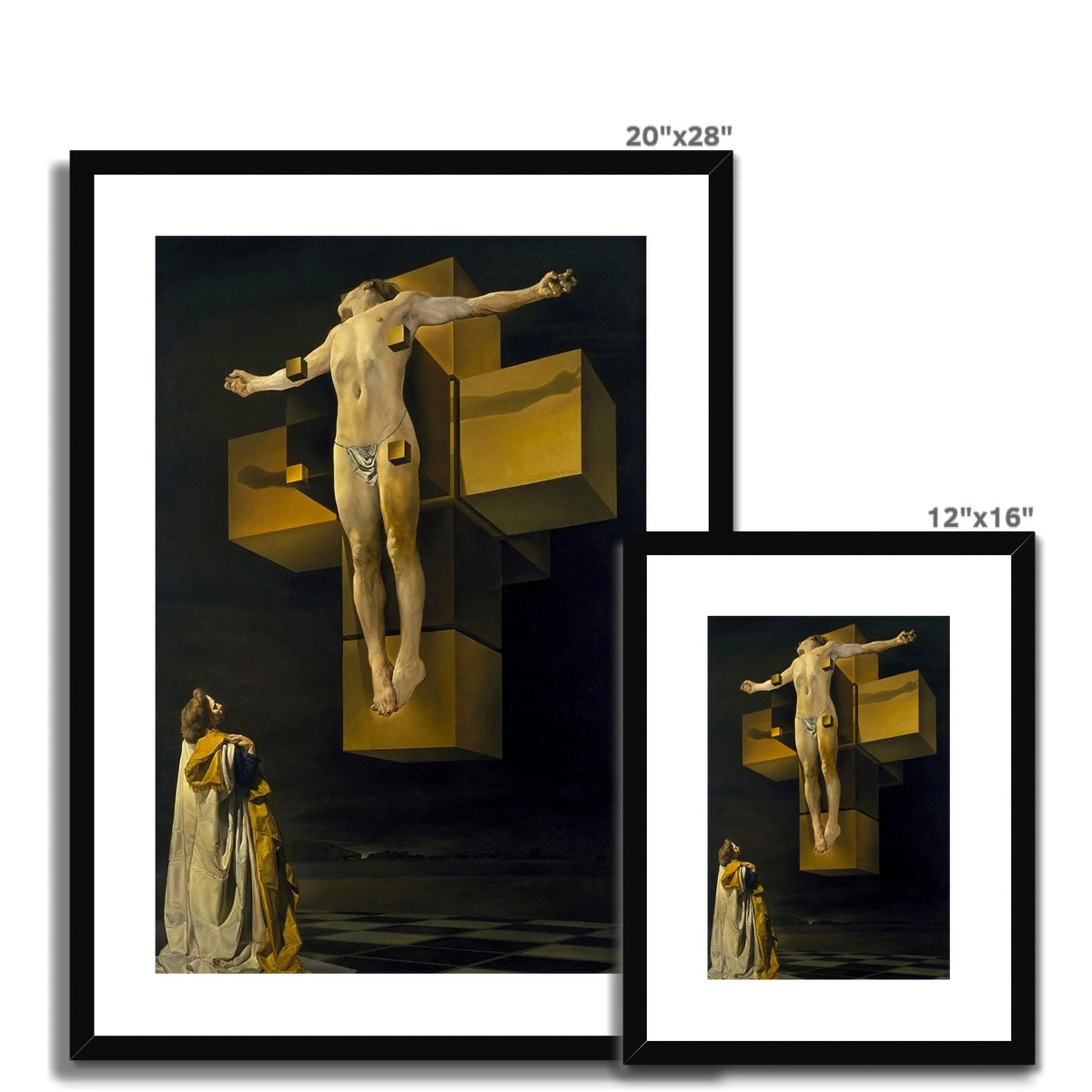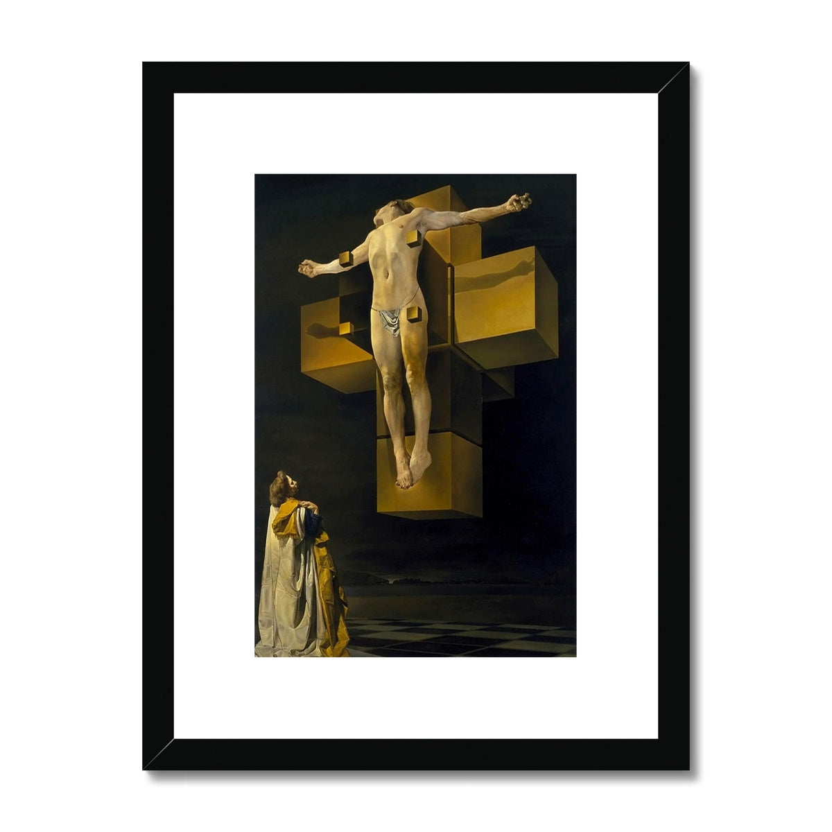 "Crucifixion (Corpus Hypercubus)" (1954) is a striking painting by Salvador Dalí that blends religious imagery with mathematical concepts. In this surreal depiction of Christ’s crucifixion, Dalí replaces the traditional wooden cross with a hypercube (a four-dimensional geometric figure unfolded into 3D space), symbolizing the fusion of science, mysticism, and spirituality. Christ is depicted with idealized, unblemished anatomy, floating above the ground. Below, a figure modeled after Dalí's wife, Gala, gazes upward in reverence. The painting exemplifies Dalí’s interest in nuclear mysticism and his effort to reconcile classical tradition with modern scientific thought.