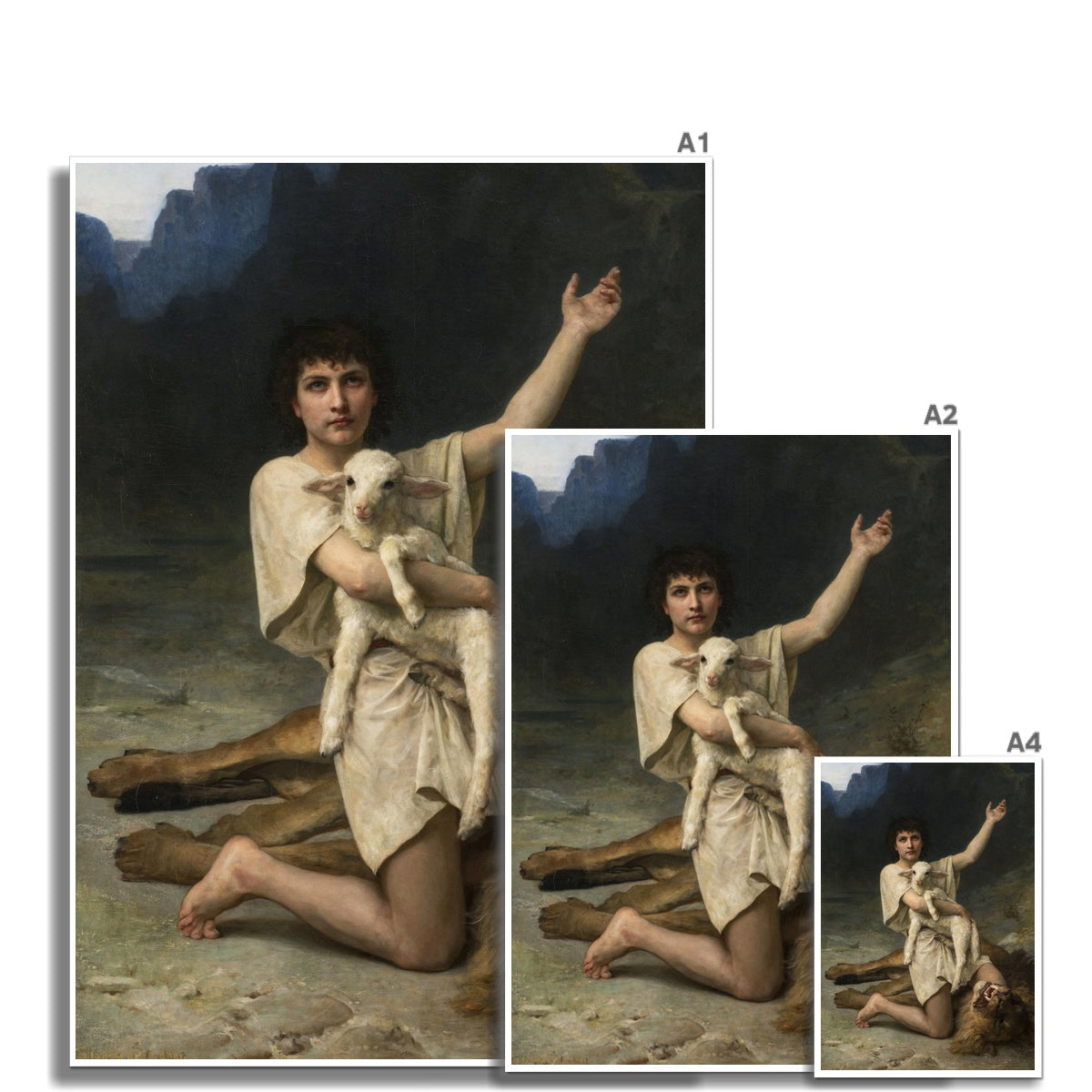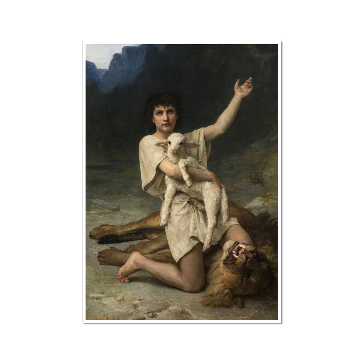 This painting, titled "David The Shepherd," was created by Elizabeth Jane Gardner around 1895. It depicts the young biblical figure David, shortly after he has slain a lion to protect his flock. David is shown kneeling with one hand raised, holding a lamb in his other arm, symbolizing his role as a protector and shepherd. The lion he has defeated lies at his feet, its fierce expression contrasting with the calm and serene demeanor of David. The painting captures a moment of triumph and divine protection, emphasizing David’s bravery and faith. Gardner’s use of realistic detail and soft lighting enhances the emotional impact of the scene, highlighting David’s youth and innocence alongside his courage.