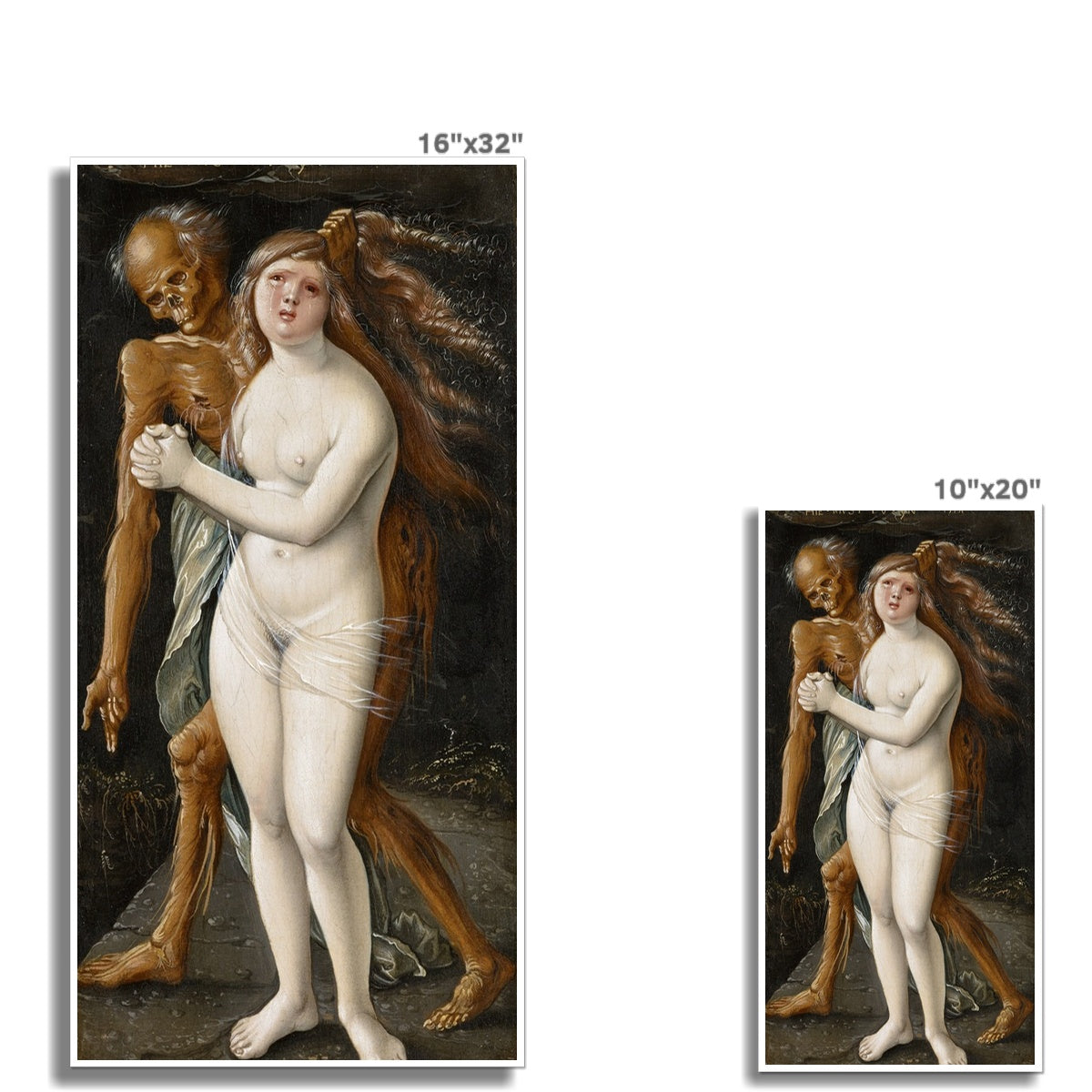 "Death and the Maiden" is a painting by the German Renaissance artist Hans Baldung, also known as Hans Baldung Grien. It was created in the early 16th century. The painting depicts a young woman being embraced by a skeletal figure of Death, who has draped his cloak over her. The maiden appears to be in a state of fear or resignation, as Death holds her in a tight embrace. The painting is widely interpreted as a representation of the inevitability of death and the transience of life. The composition is thought to be symbolic of the fleeting nature of youth and beauty, and serves as a reminder of the constant presence of death. "Death and the Maiden" is considered to be one of Baldung's most powerful and iconic works, and is a masterpiece of Northern Renaissance art.