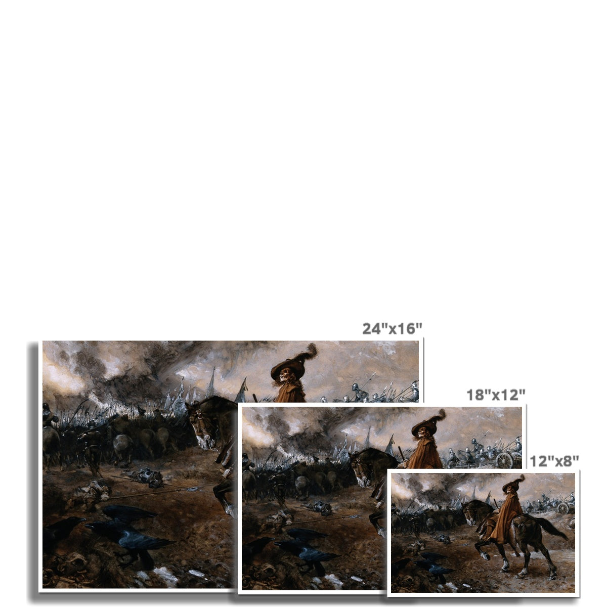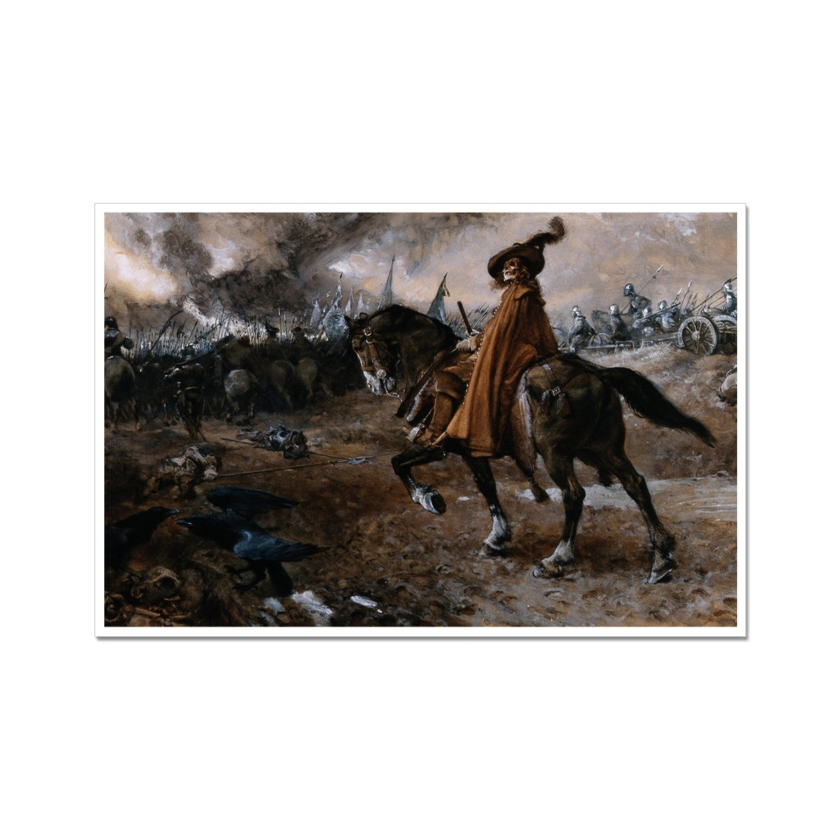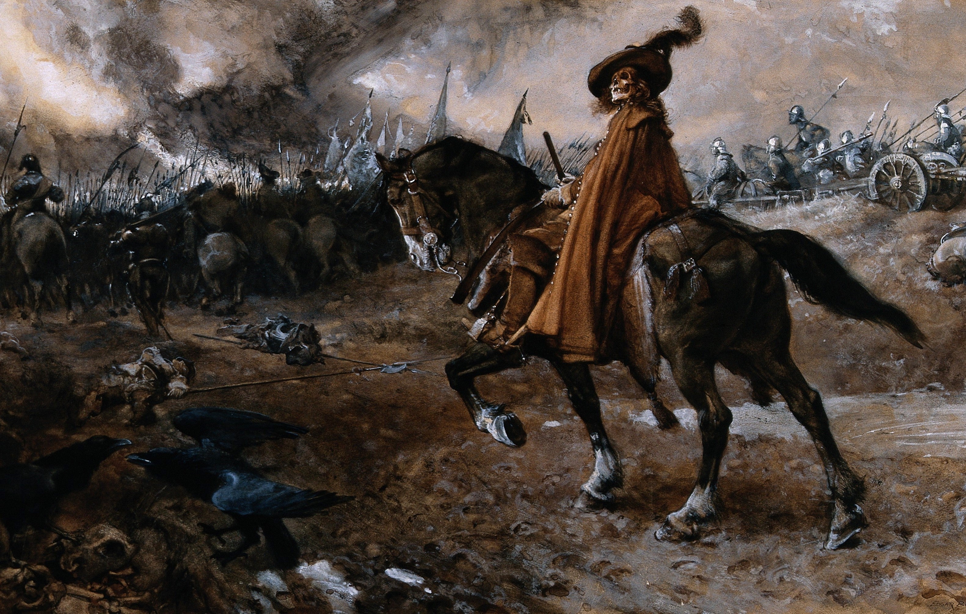 The painting "Death as General" by Edgar Bundy, created around 1911, portrays a skeletal figure clad in a general's attire, riding a dark horse. The figure, representing Death, dons a broad-brimmed hat and a long, flowing cape. The background is filled with an array of soldiers and military paraphernalia, suggesting a battlefield scene. This composition likely symbolizes the omnipresence of death in war, with the general personifying the inevitable and impartial nature of mortality during conflict. The sombre tones and the presence of scavenging birds enhance the painting's macabre and ominous atmosphere.