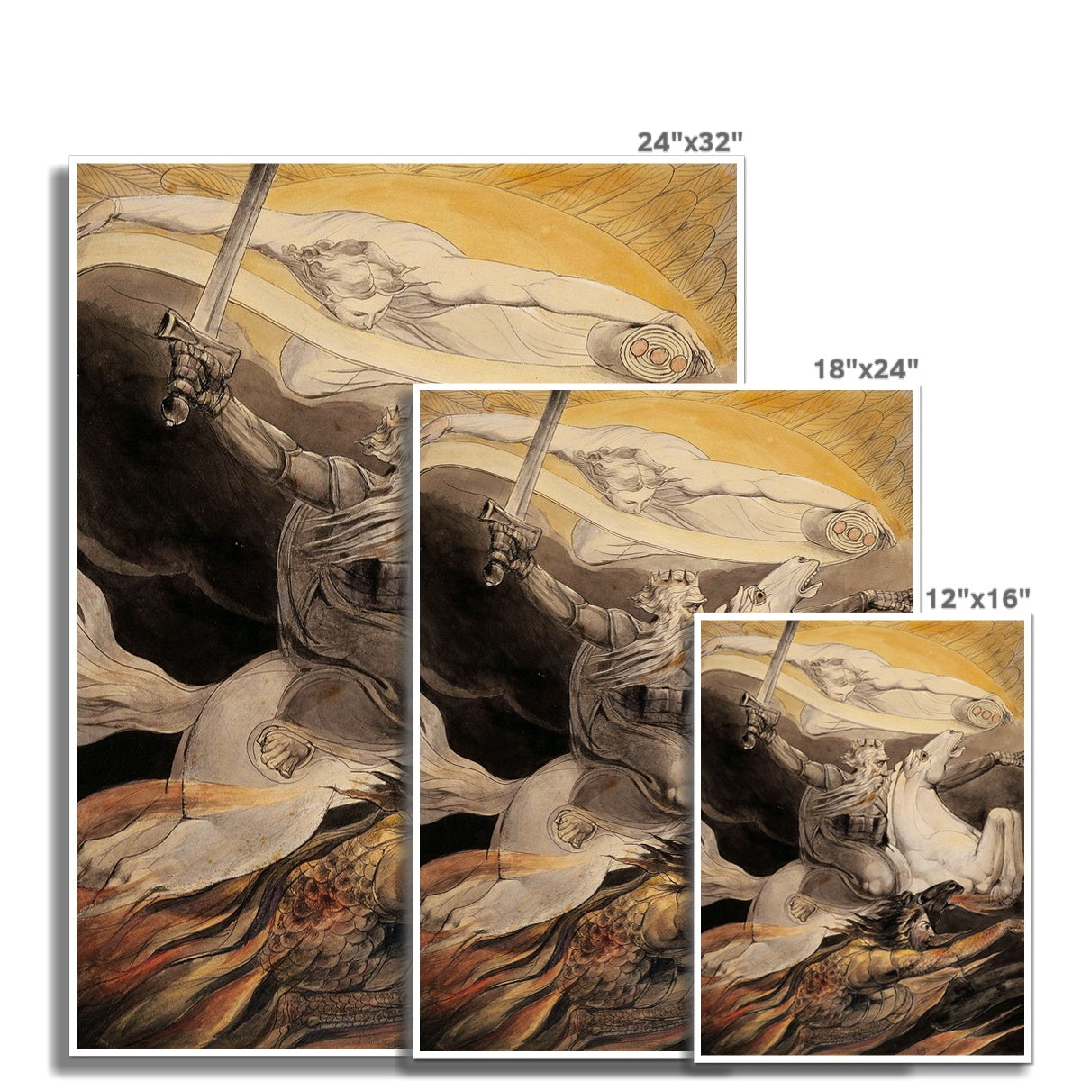 Above the rider, a celestial figure unfurls a scroll, likely symbolizing the divine decree or the prophecy being fulfilled. The use of swirling lines and contrasting light and dark tones adds to the painting's sense of movement and foreboding, typical of Blake's unique, visionary style. Blake’s work often blends the real with the mystical, and this painting is no exception. It evokes a sense of dread and awe, capturing the unstoppable nature of death as foretold in apocalyptic literature. The overall composition and use of color emphasize the dramatic, almost surreal quality of the scene, making it a powerful example of Blake's imaginative approach to biblical themes.