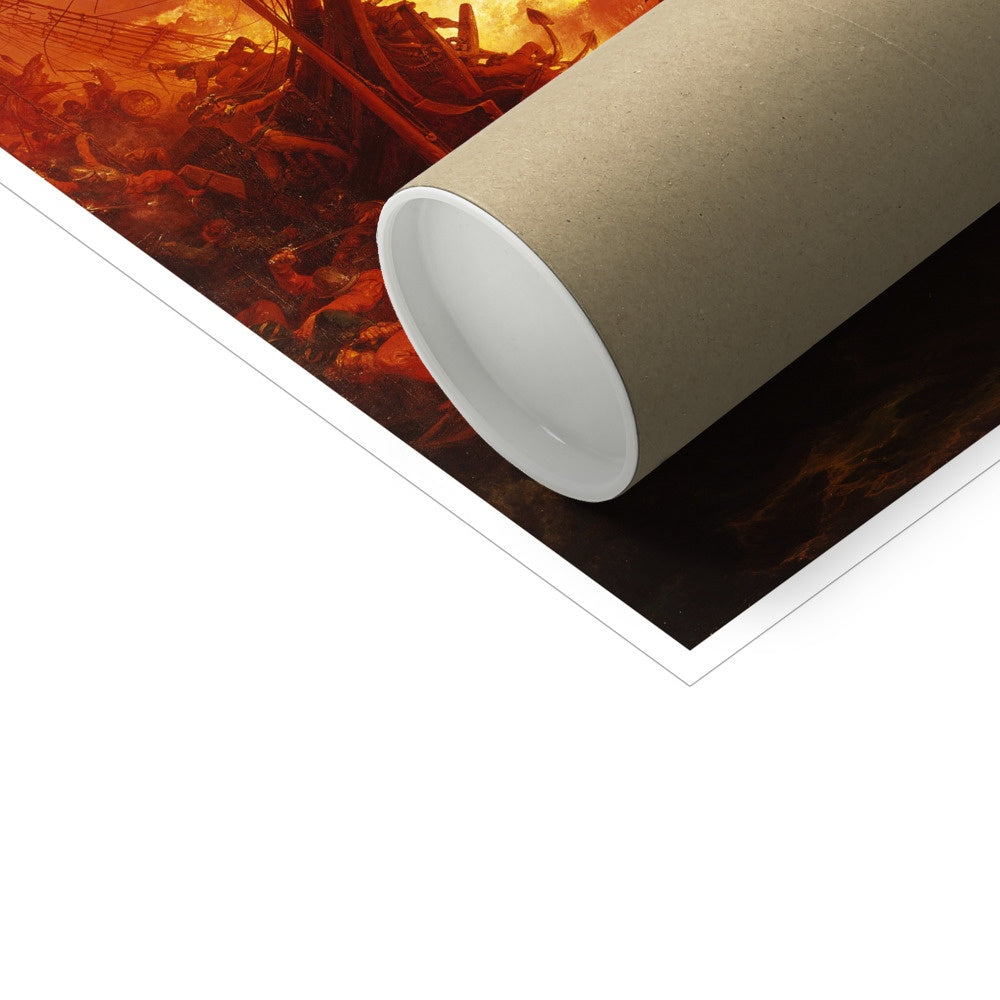 Defeat of the Spanish Armada, 8 August 1588. A theatrical interpretation of the Battle of Gravelines, an historical episode that had taken place over 200 years earlier. The artist's painterly response depicts the dramatic nature of the event, together with a vivid use of light and colour to enhance the intensity of the image and the sense of violent struggle. The narrative shows the morning after the English fireship attack on the Armada in Calais Roads, which found the Spaniards in a north-westerly gale off Dunkirk. A shift in the wind direction prevented many of their ships from being wrecked on the surrounding shoals. Saved from this disaster, they fought all day with the English and Dutch until they turned northwards, defeated, on their retreat around Scotland.