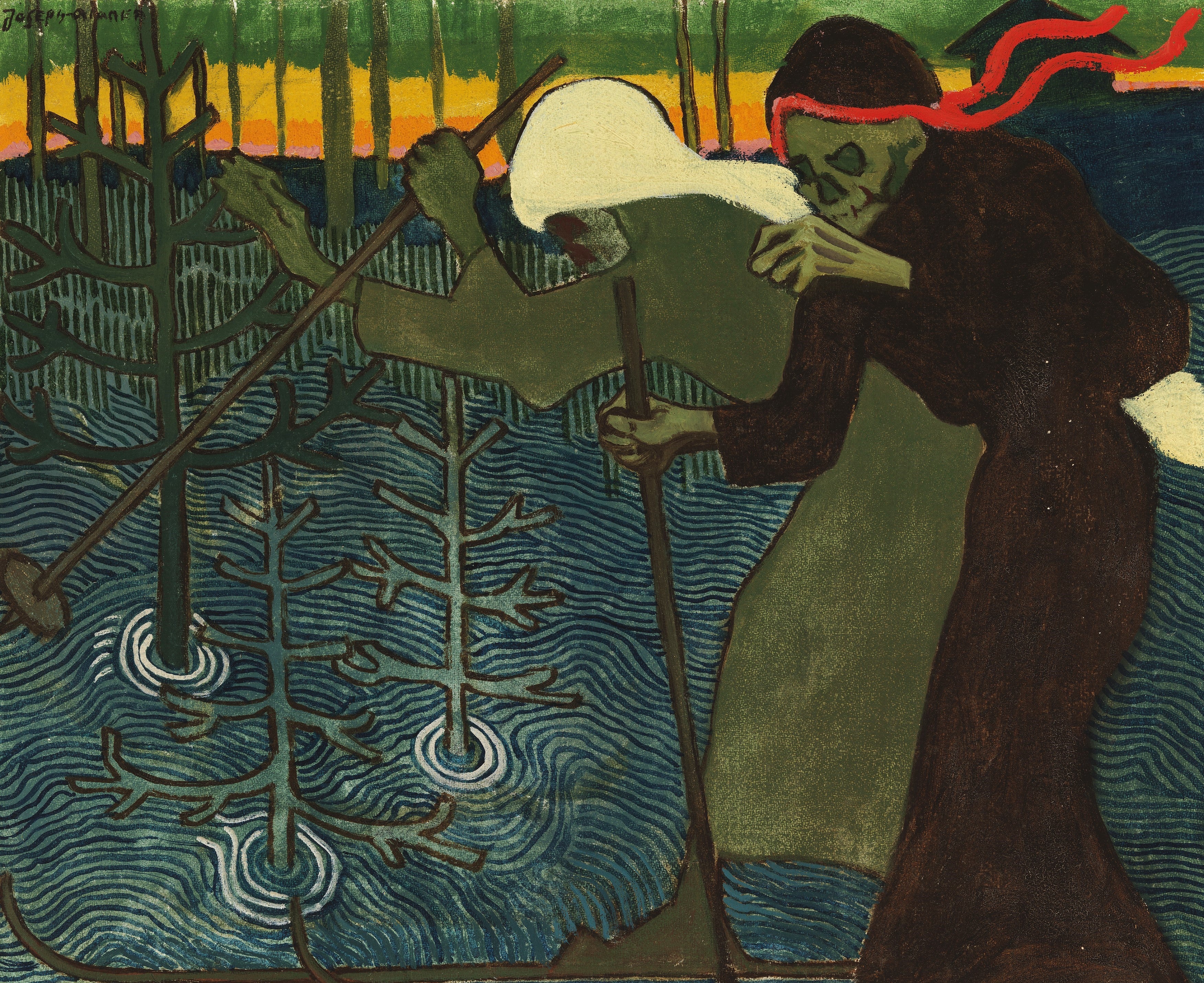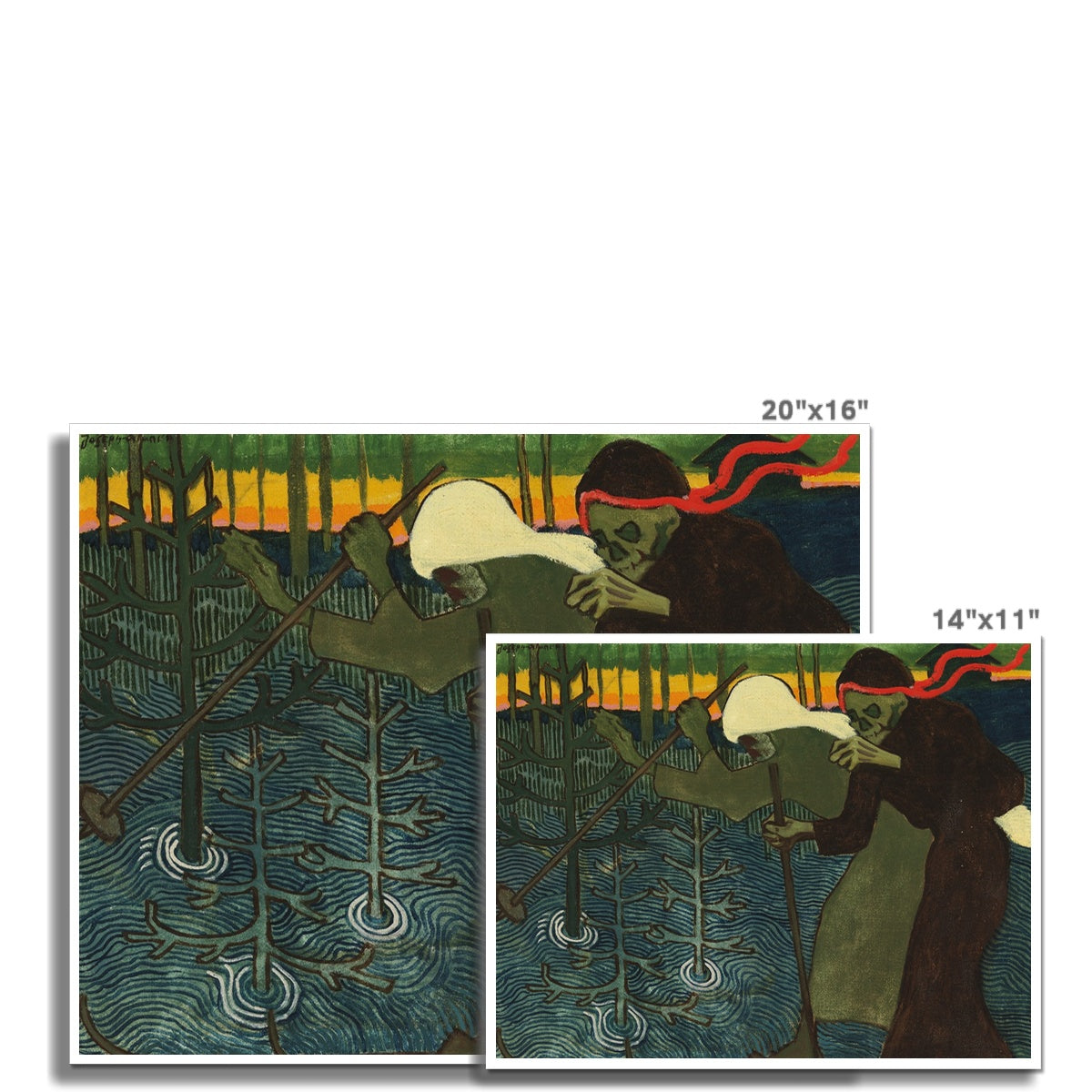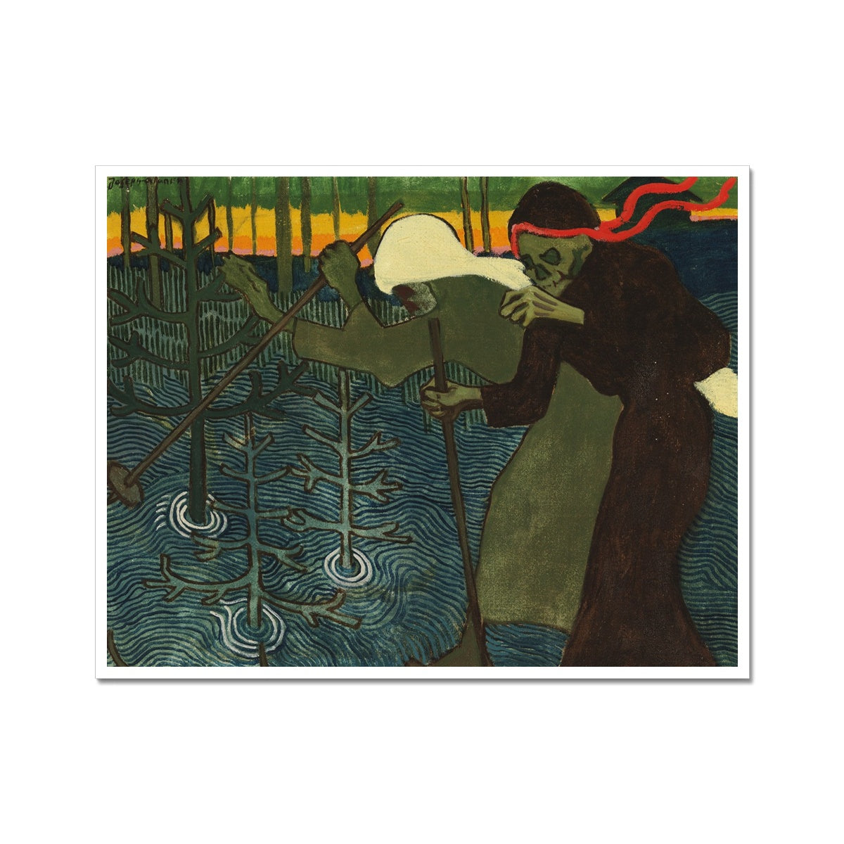 "Disease and Death" by Joseph Alanen is an evocative painting from the 19th century that delves into the themes of illness and mortality, which were common subjects in the art of that era, especially within the Symbolist movement. These skeletal figures are set against a backdrop that features barren trees and swirling patterns in the water, suggesting the disturbance and chaos brought about by disease. The striking contrast between the vibrant sunset and the dark, foreboding figure of death serves to highlight the juxtaposition between life and the inevitability of death. The red scarf flowing from one of the figure’s head adds a dynamic element to the composition, possibly symbolizing the fever and heat of illness. The overall composition of the piece, with its stark imagery and bold colours, communicates a powerful message about the inescapable nature of death and the suffering caused by disease.