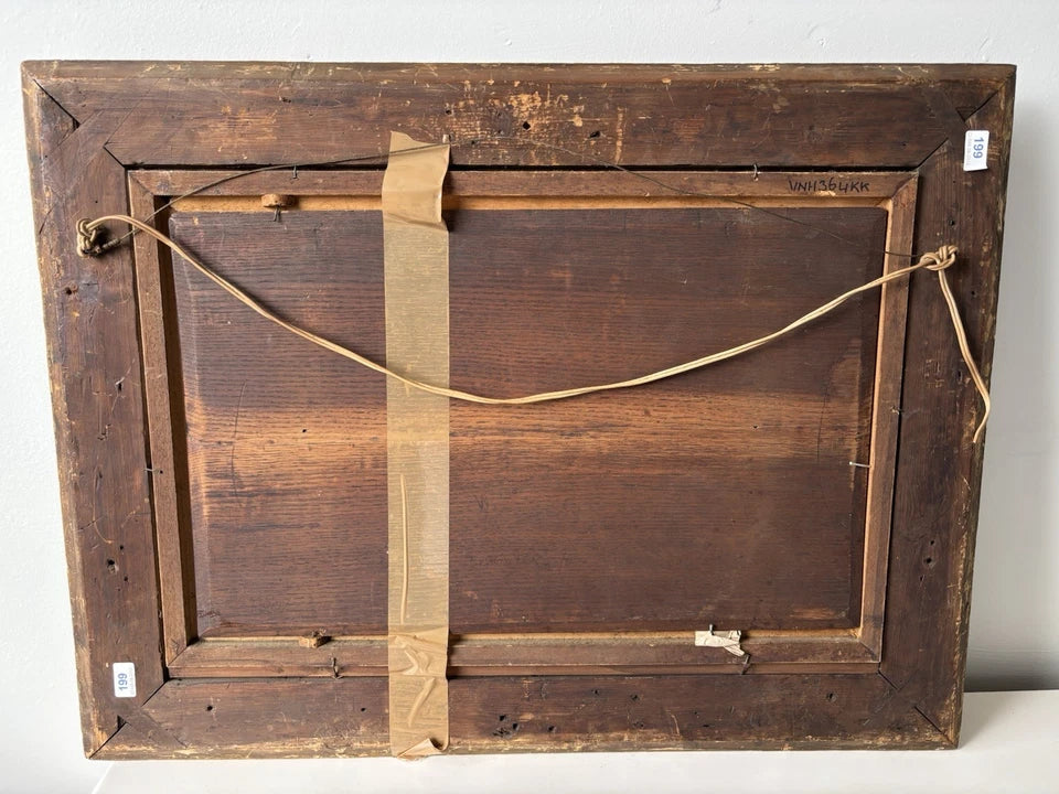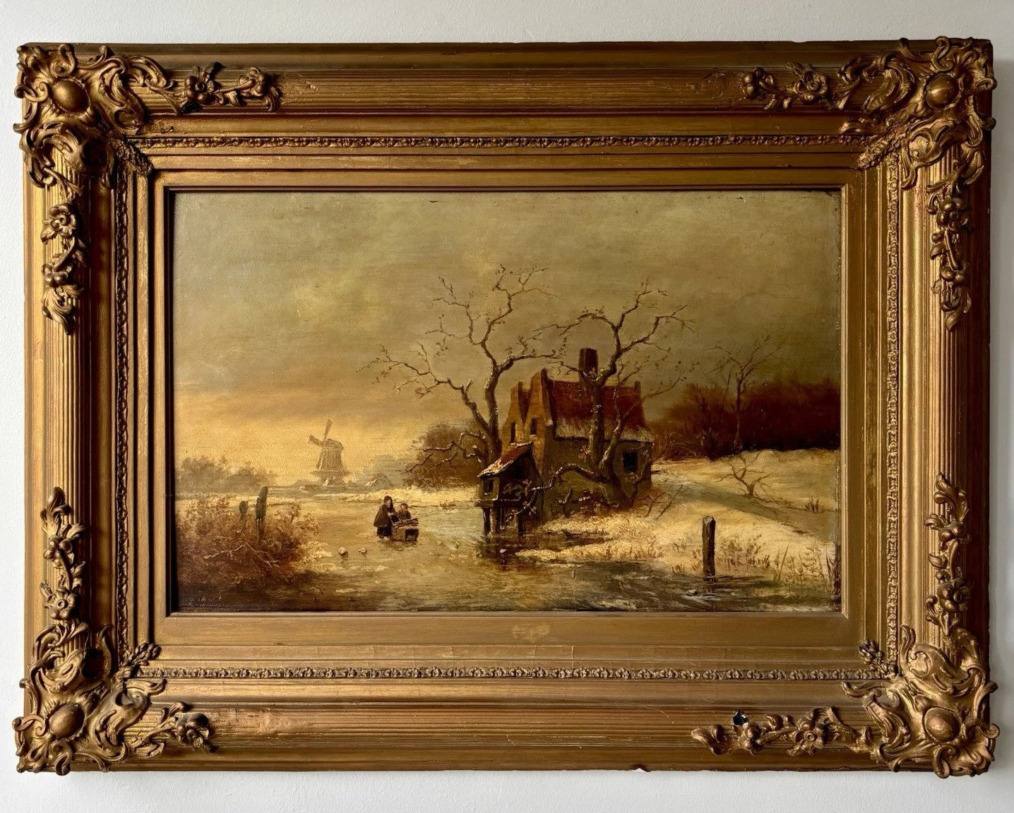 The work is set within an ornate antique gilt frame, richly decorated with sculptural detail that enhances the painting’s warm, nostalgic tone. An evocative and highly decorative example of Dutch Romantic landscape painting by an unknown hand.