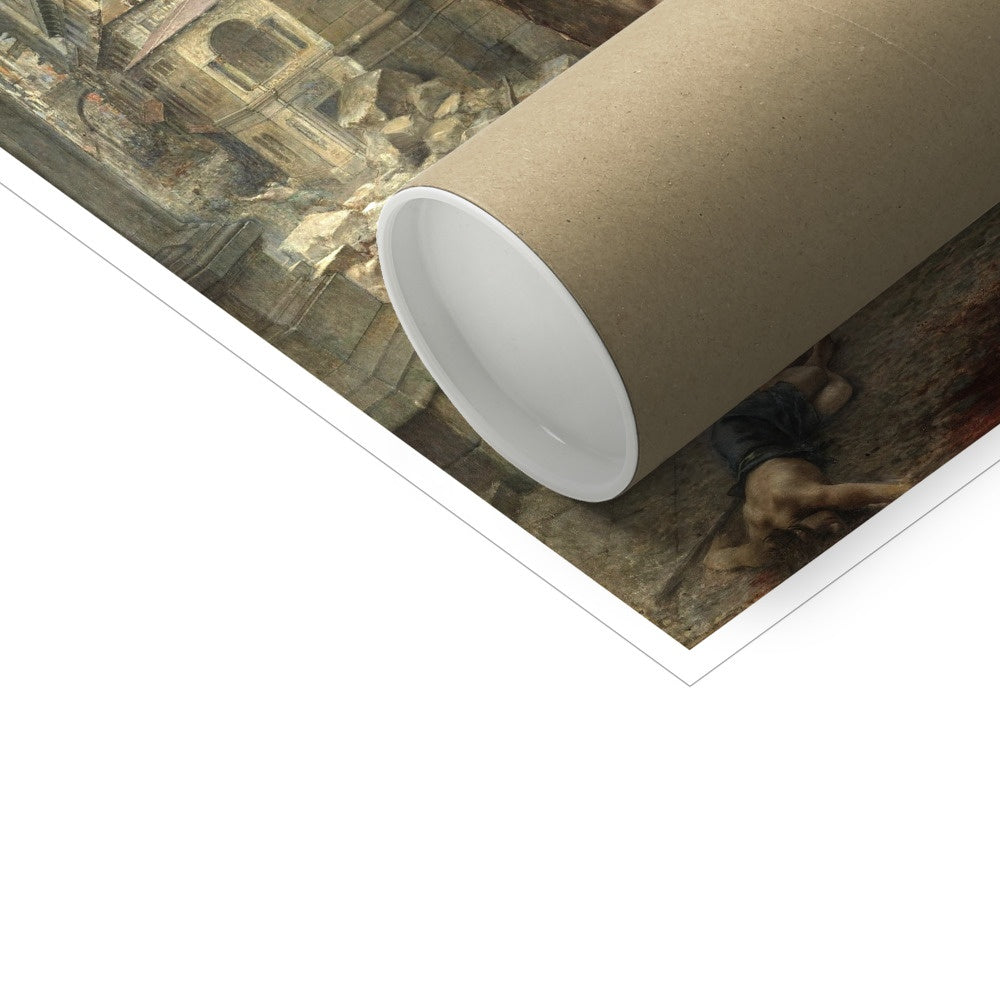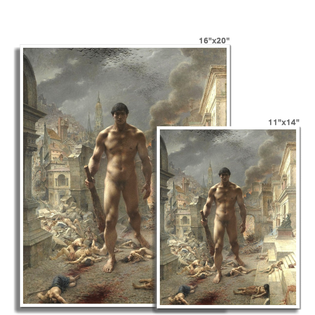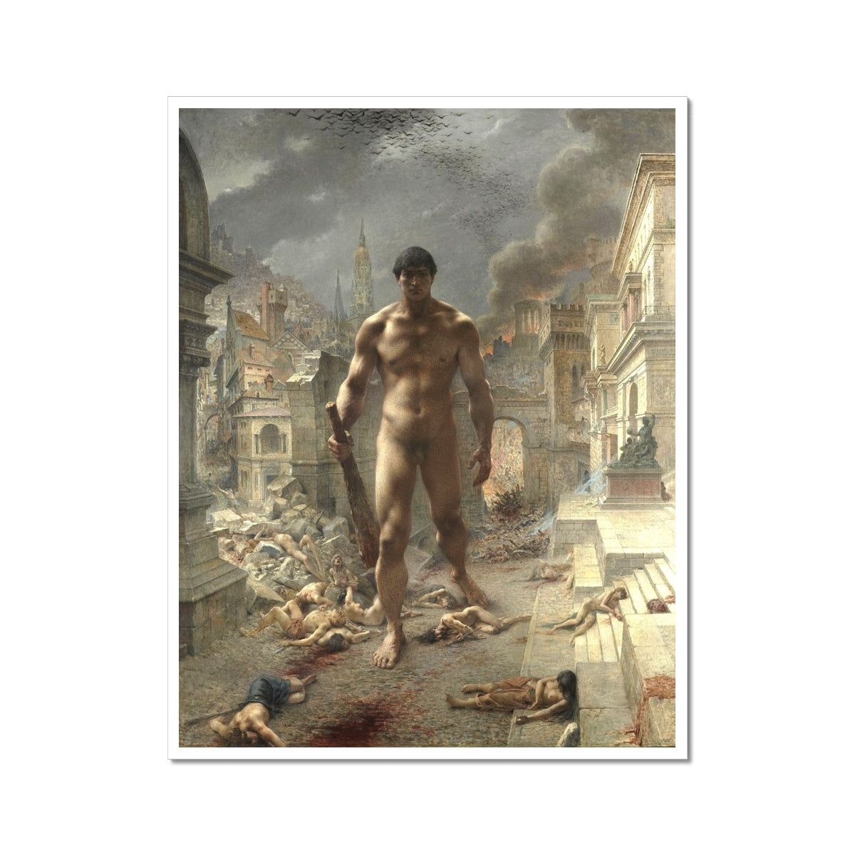 Experience the power of Henri Camille Danger's 1901 masterpiece, Fléau! This fine art print captures a destroyed city and dead bodies beneath a towering nude giant, evoking feelings of devastation and awe. An unforgettable work of art.