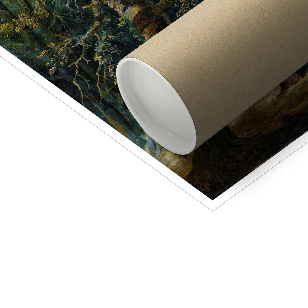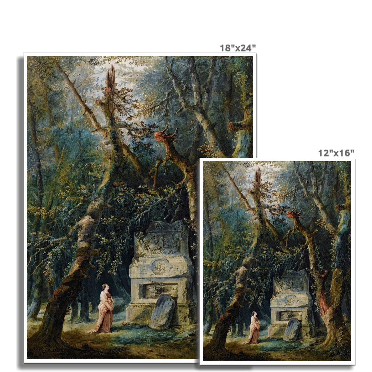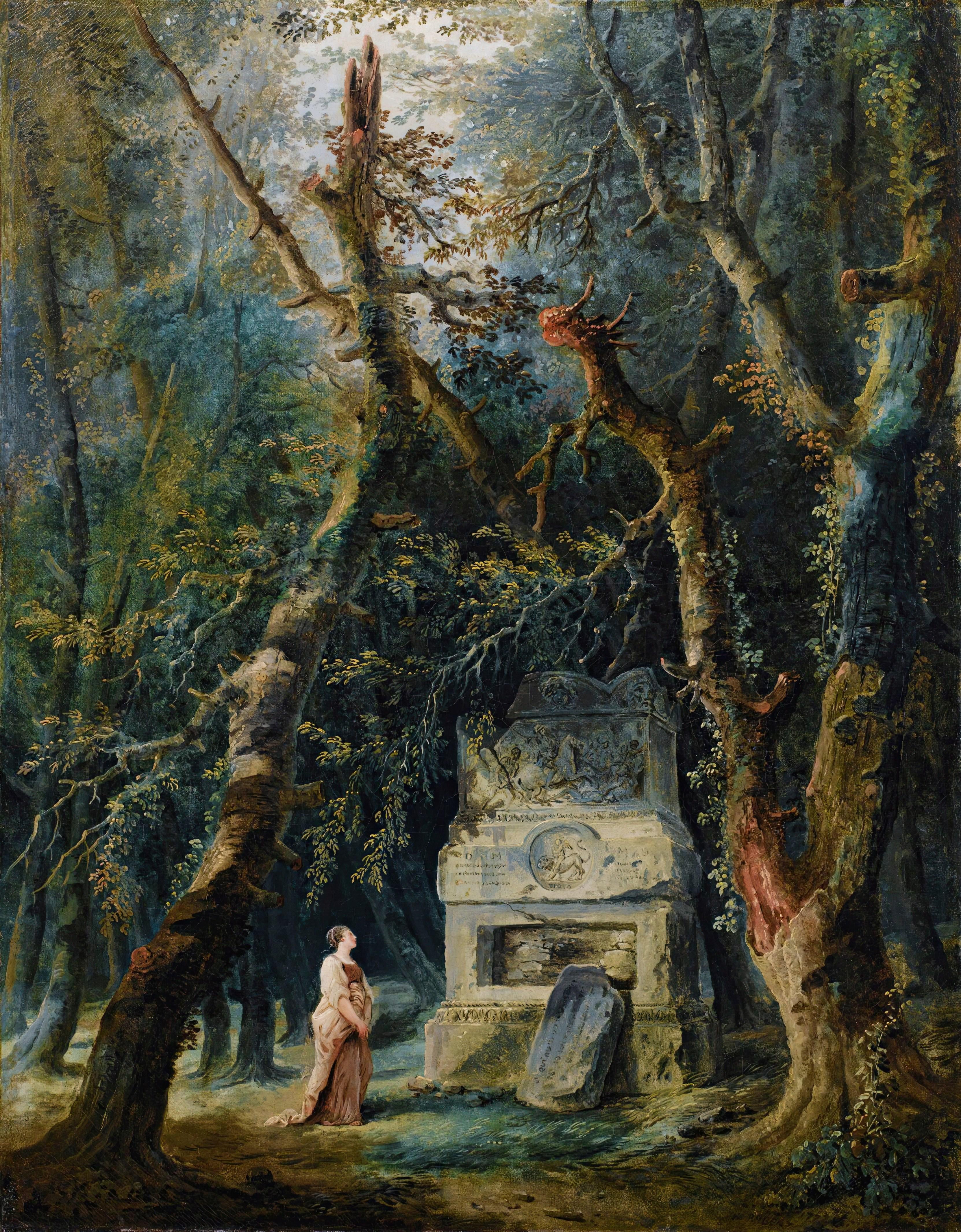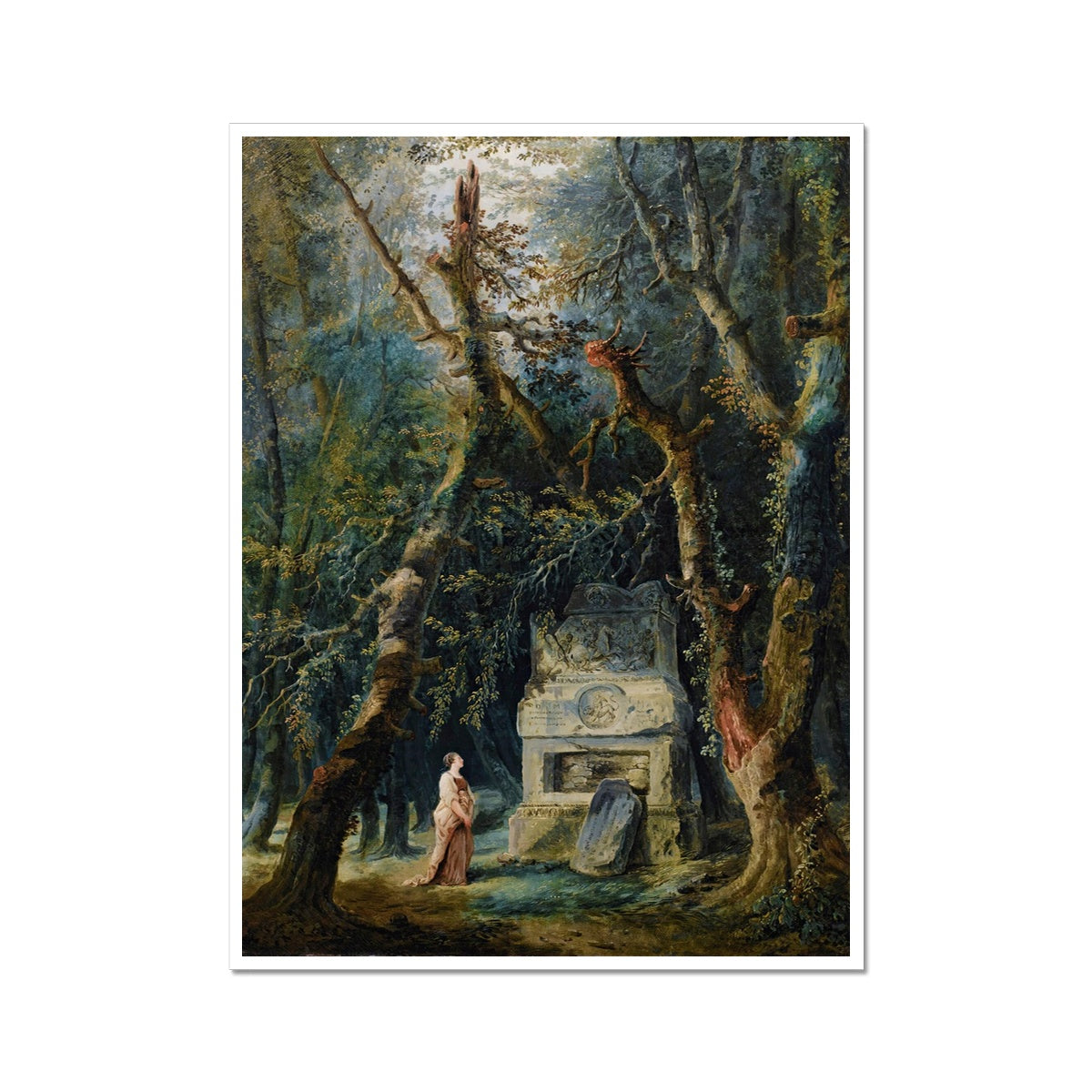 "The Lonely Walk" by Hubert Robert, created around 1777, depicts a serene yet sombre scene. A solitary figure, clothed in period attire, stands in a dense, overgrown forest. Her gaze is directed towards an ornate, crumbling tombstone, which stands as a poignant reminder of the past amid the encroaching forces of nature. The trees loom large, their trunks twisted and leaves lush, suggesting the wild, untamed growth of the woods. Sunlight filters through the canopy, casting dappled light and creating a contrast between light and shadow. The painting invokes a sense of contemplation and the sublime, typical of Robert's romantic landscapes which often feature ruins and the beauty of decay.