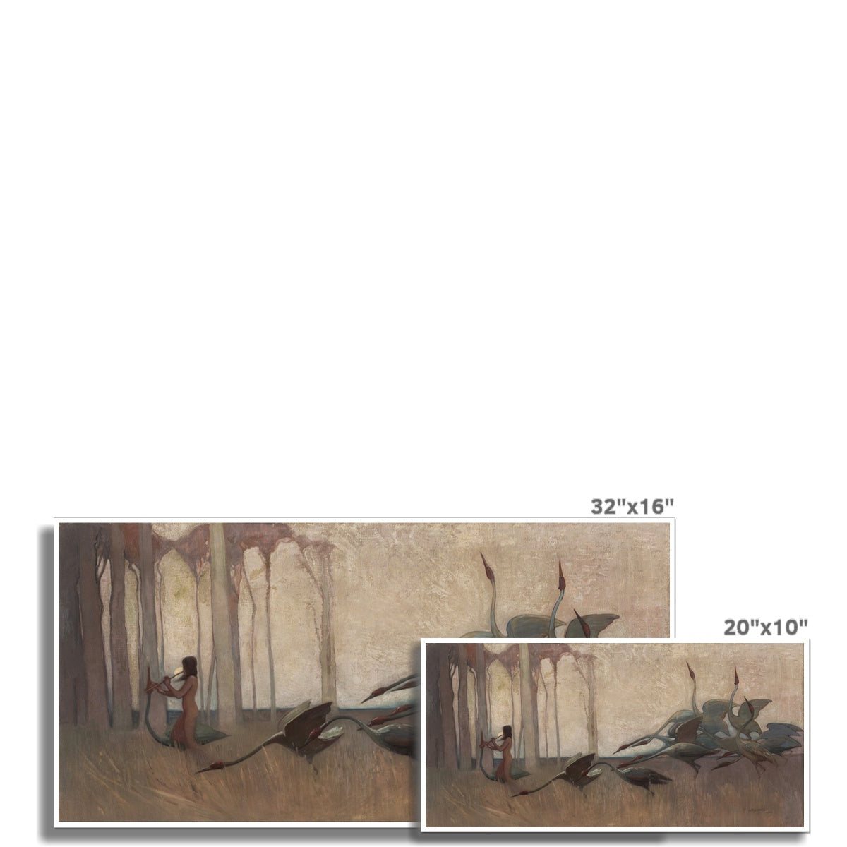 In Spirit of the Plains was painted in 1897 by artist Sydney Long. He introduced a mythological theme into Australian artwork. This particular work evokes a distant, dreamlike and identifiably Australian landscape, featuring the brolga, a wetland bird found in northern Australia and well known for its elaborate mating dance.