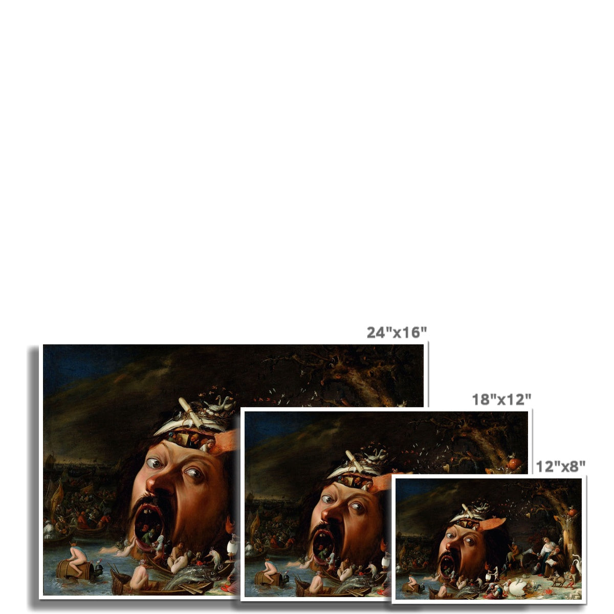 In the foreground, the painting presents a large, grotesque face that dominates the scene, with smaller figures and bizarre creatures scattered around, engaging in various activities. The face itself is adorned with a crown-like headpiece, with small figures sitting upon it, suggesting a scene teeming with life and hidden narratives. The background reveals a tumultuous landscape filled with additional figures and fantastic elements, all seemingly part of a dreamlike vision. The dark, brooding sky and the assortment of activities create a sense of overwhelming sensory experience, which aligns with the concept of St. Anthony being tempted by a myriad of earthly distractions and demonic illusions.