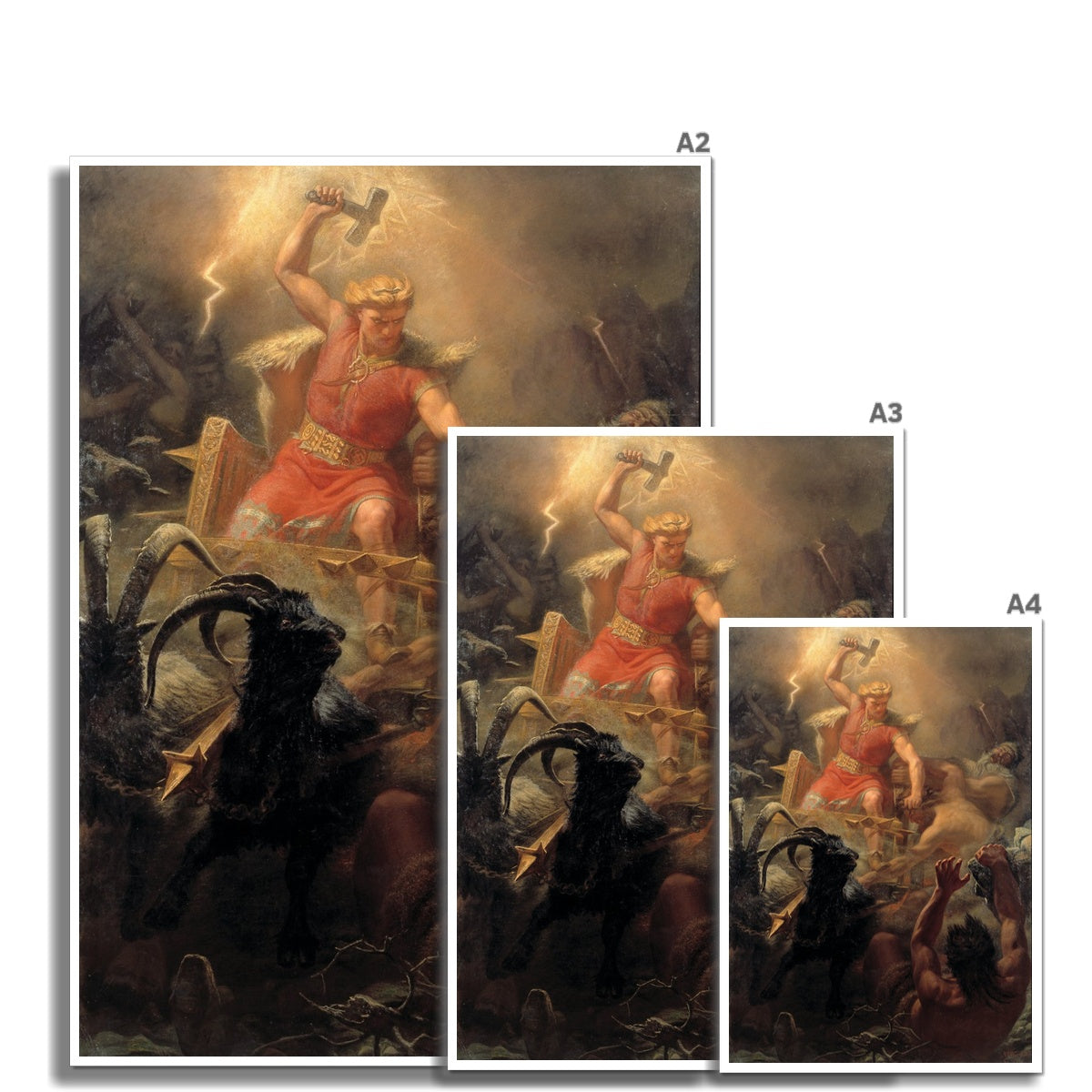 Thor's Fight with the Giants is an 1872 painting by the Swedish artist Mårten Eskil Winge. It depicts the Norse god Thor in a battle against the jötnar. The thunder god rides his chariot pulled by the goats Tanngrisnir and Tanngnjóstr, wears his belt Megingjörð, and swings his hammer Mjölnir, which is wreathed in lightning.