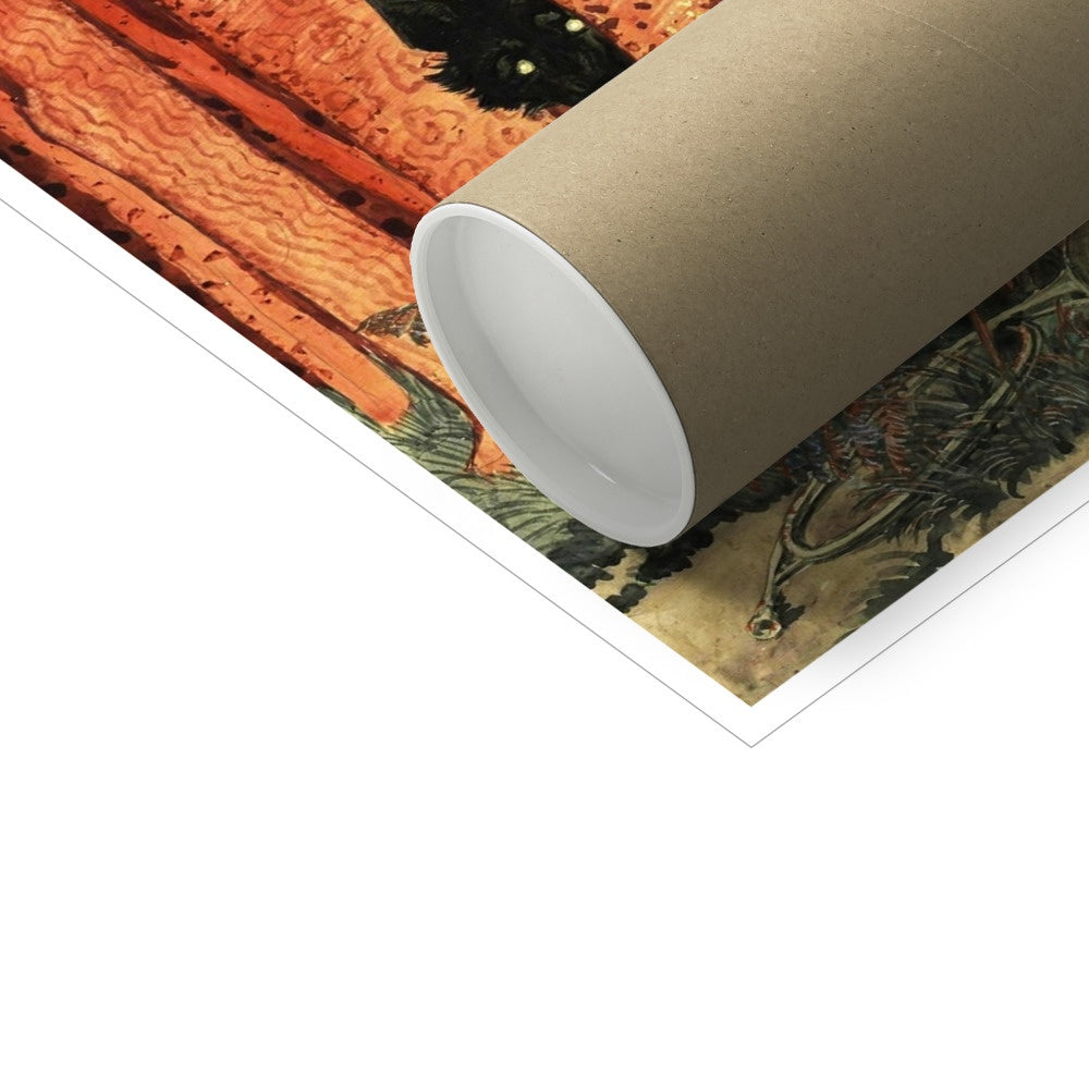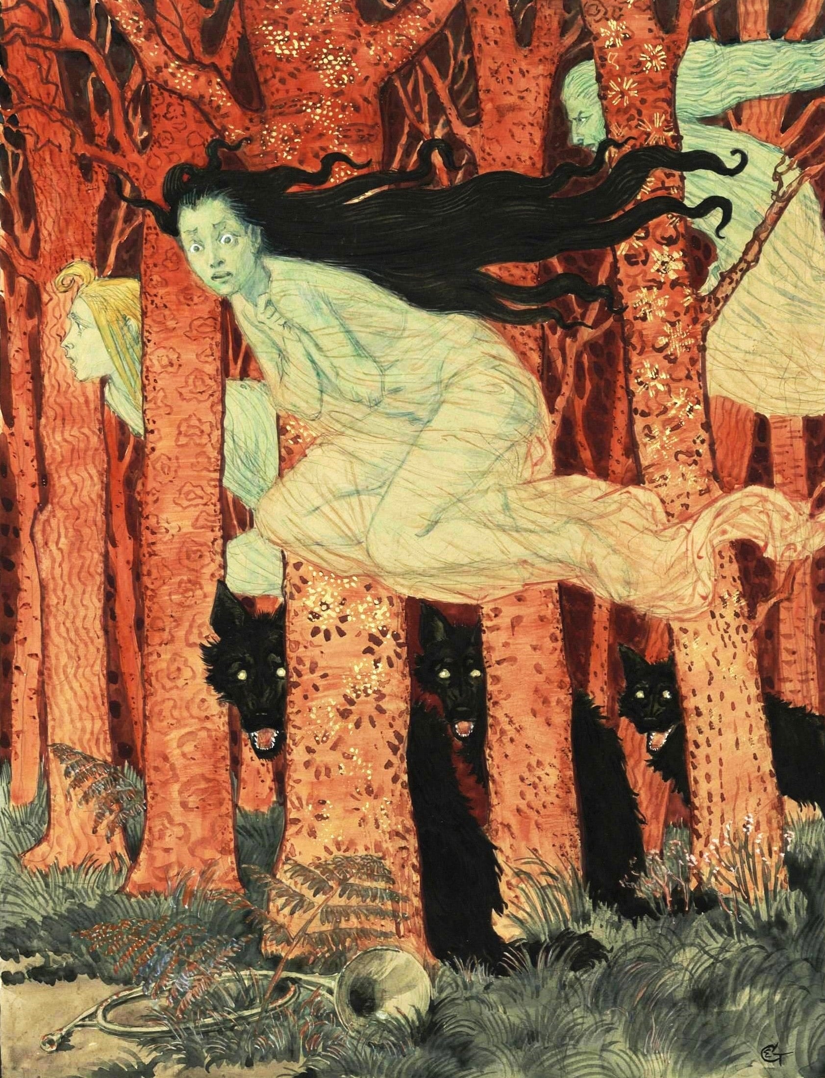 The painting "Three Witches and Three Wolves" by Eugène Grasset, created around 1900, portrays a mystical and foreboding scene set in a dense forest. The artwork features three distinct witches, each with unique expressions and postures, suggesting a sense of urgency or alarm. Their flowing garments blend with the ethereal environment, dominated by vibrant orange and red hues. Additionally, three sinister black wolves appear amongst the trees, adding a sense of menace to the scene. Grasset uses a detailed and ornamental style, with intricate patterns on the tree barks and shimmering accents that create a rich texture and depth, conveying a magical, almost otherworldly atmosphere.
