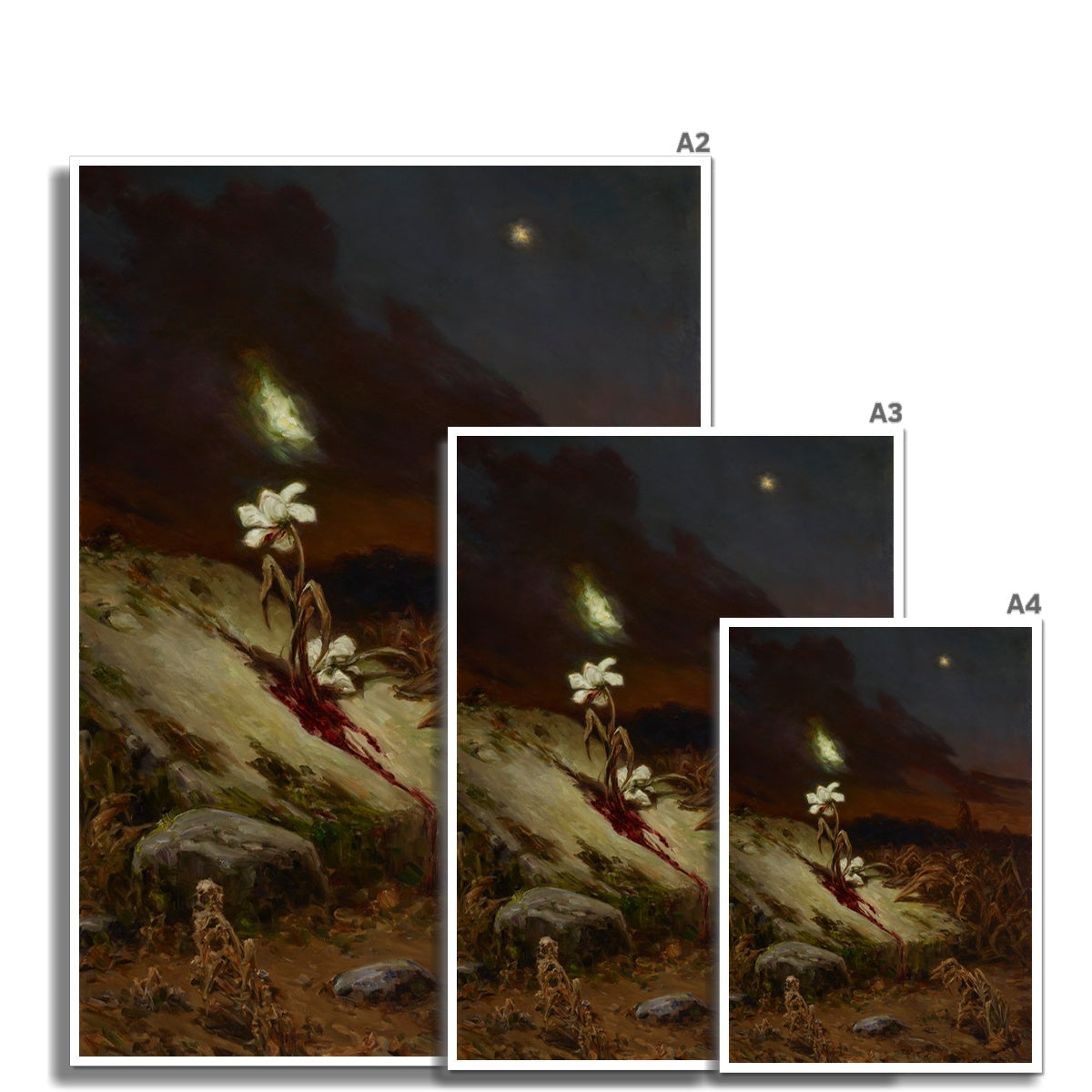 This painting depicts a somber and haunting night scene, with a solitary white flower blooming through a derelict tomb stone, illuminated by a dim light from above. A dark, dense atmosphere envelops the scene, under a night sky. The flower appears to be bleeding, symbolizing the act of suicide. The surrounding landscape is barren and desolate, with dried plants and lifeless terrain, enhancing the sense of isolation and tragedy. The artwork captures a poignant moment of beauty and sorrow intertwined.