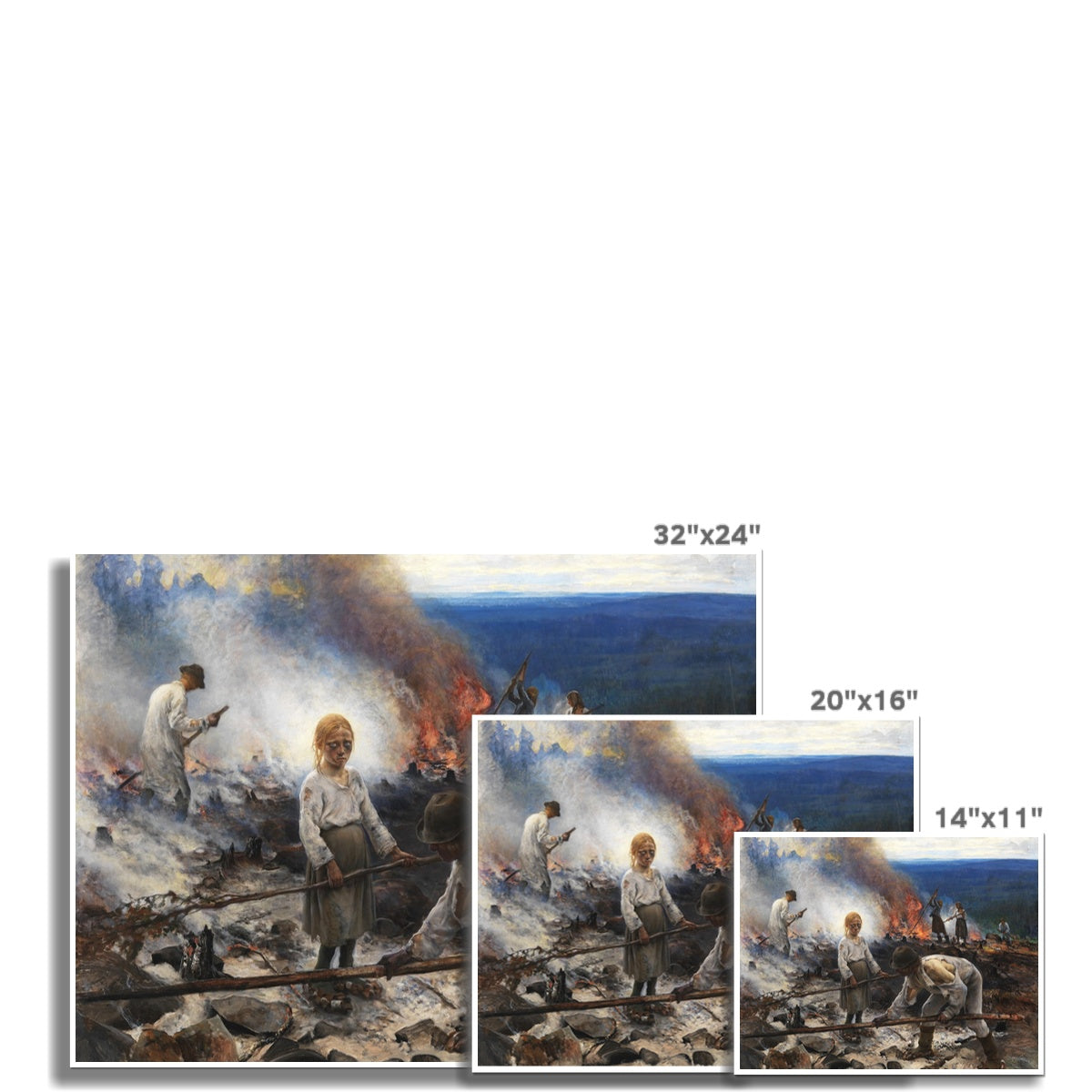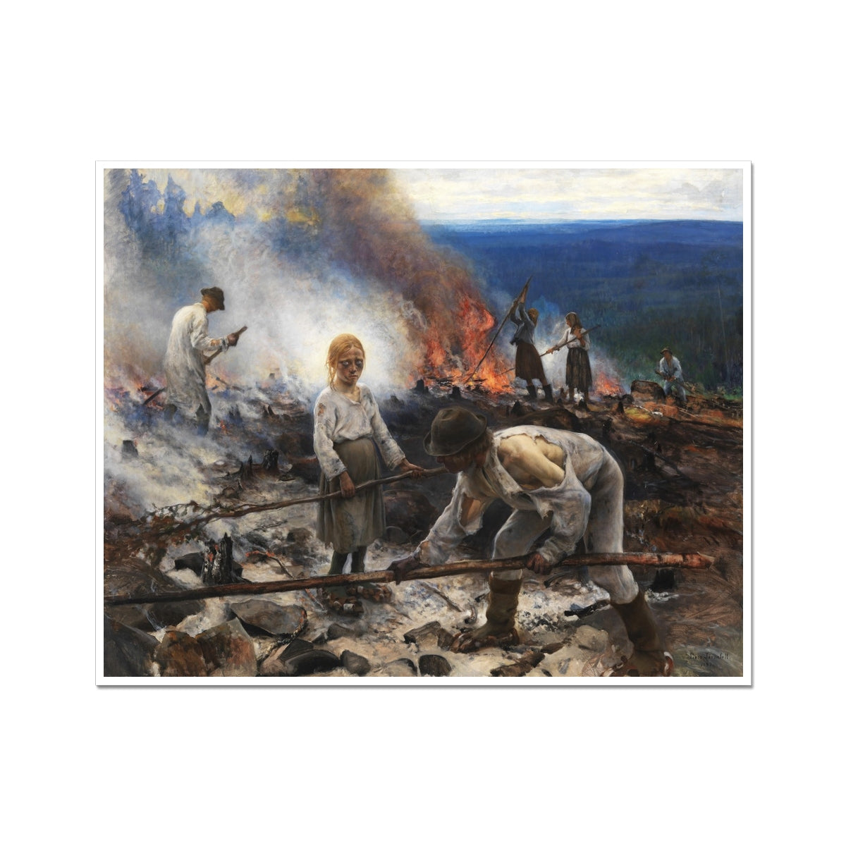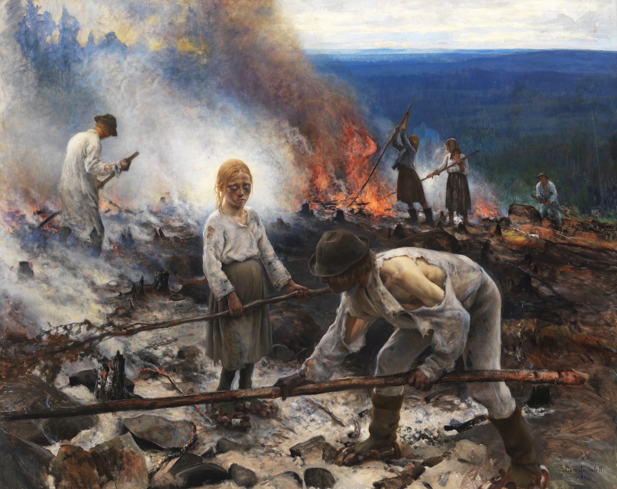 Under the Yoke (Burning the Brushwood) (1893) by Eero Järnefelt depicts Finnish peasants engaged in slash-and-burn farming. The painting highlights the harsh labor required to clear land, with smoke and fire dominating the scene. The central girl, modeled after a 14 year old participant, adds emotional depth to this vivid portrayal of rural life.