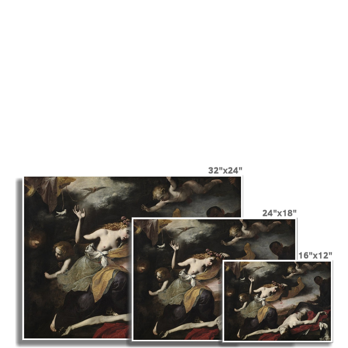 Venus, the goddess of love, urged her mortal lover Adonis to hunt only the easiest game. Yet he insisted on pursuing boar, which eventually gored him to death. In this scene, Venus discovers the young man robbed of his youth, yet the painting eternally preserves him in a state of perfection. This paradox corresponds to wordplay in Italian poetry from the 1600s, with which many artists sought visual parallels in their work. This painting derives from a 1623 poem by Giovanni Battista Marino. The painter remains unknown, although the sophisticated literary reference, dramatic use of light, and vivid use of colour demonstrate the artist’s awareness of trends converging in Naples in the mid 1600s.
