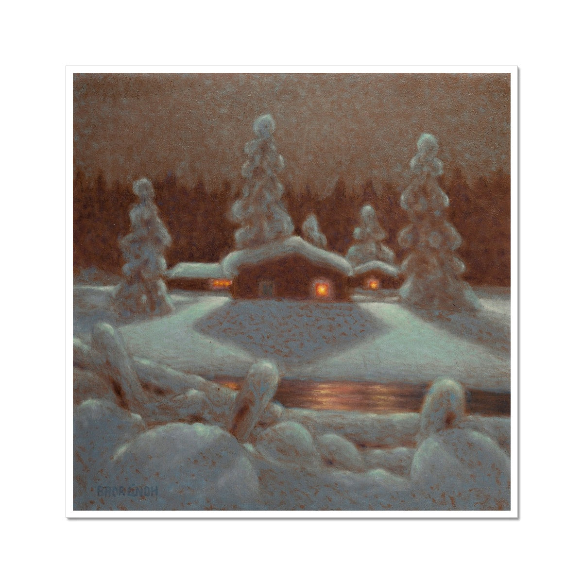 Bask in the calming winter scenery of Bror Lindh's 19th century fine art print, "Winter Night". This beautiful piece features a cozy cottage illuminated against the night sky, inviting viewers into a cozy night among the peaceful snowfall.