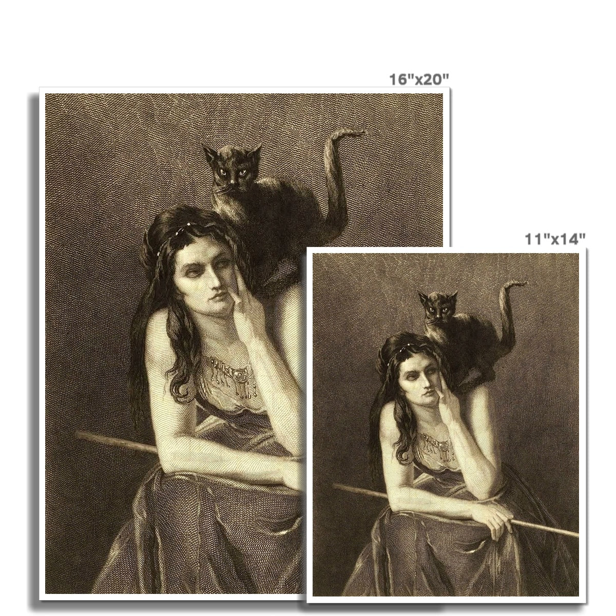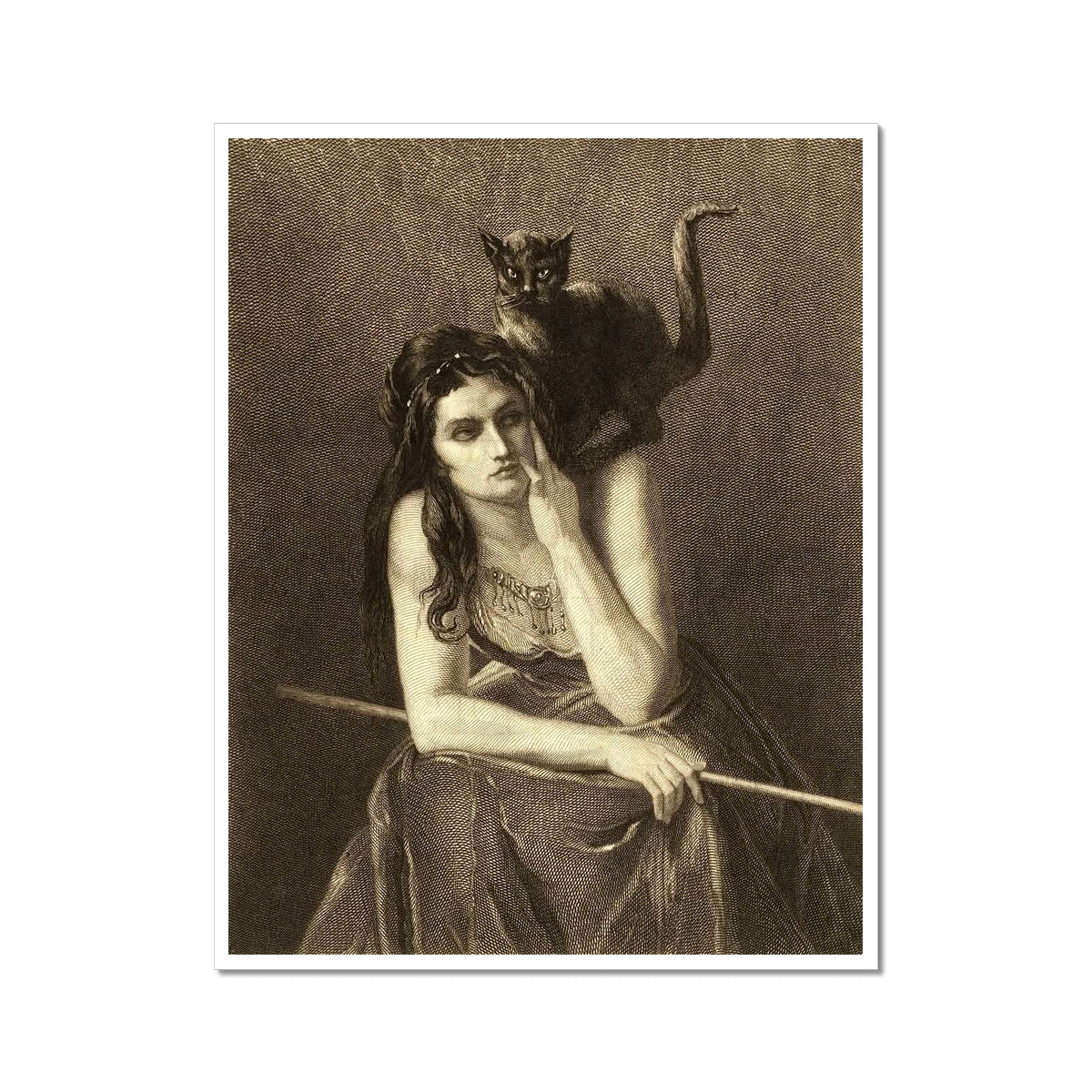 This meticulously rendered engraving portrays a pensive woman in classical attire, seated with a solemn expression. A black cat rests on her shoulder, introducing an element of enigma and alluding to themes of mysticism or the occult. With one hand supporting her head and the other holding a staff, the composition suggests introspection, feminine power, and symbolic depth—hallmarks of Auguste Danse’s refined etching technique.