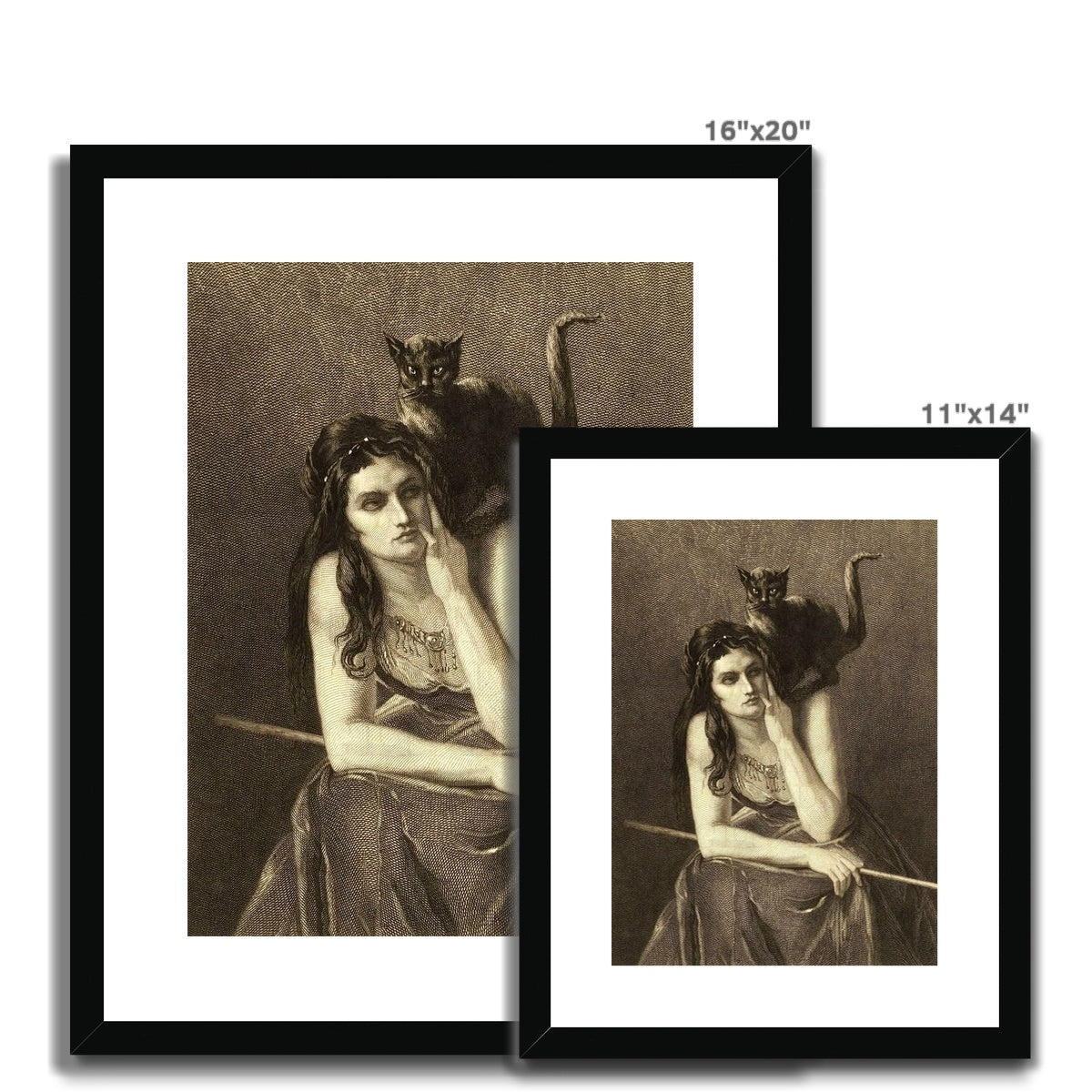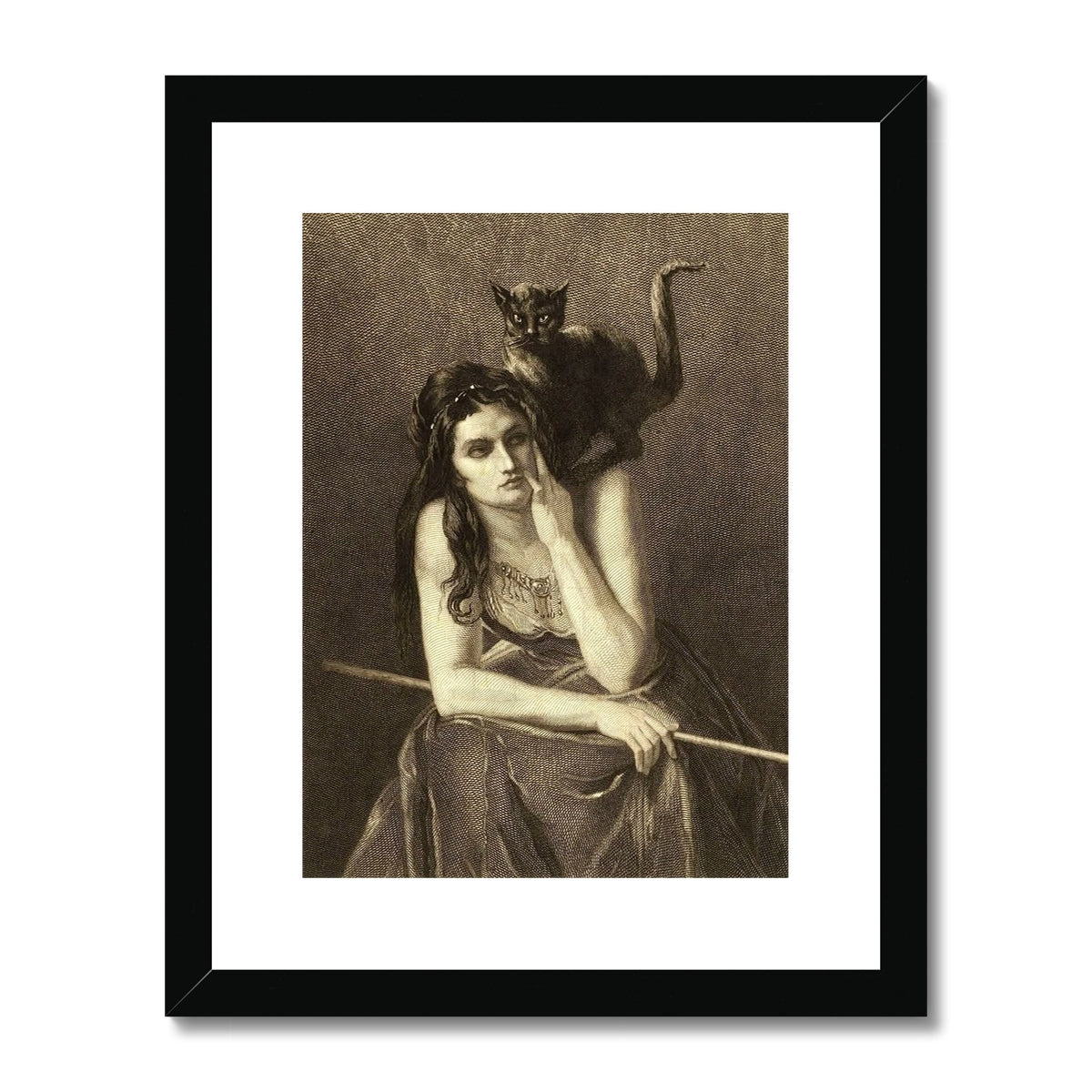 This meticulously rendered engraving portrays a pensive woman in classical attire, seated with a solemn expression. A black cat rests on her shoulder, introducing an element of enigma and alluding to themes of mysticism or the occult. With one hand supporting her head and the other holding a staff, the composition suggests introspection, feminine power, and symbolic depth—hallmarks of Auguste Danse’s refined etching technique.